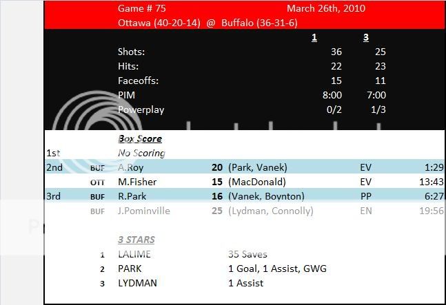 Have the scoreboard (1, 2, 3, OT, F), 3 Stars, shots per period and possibly the goalies.
