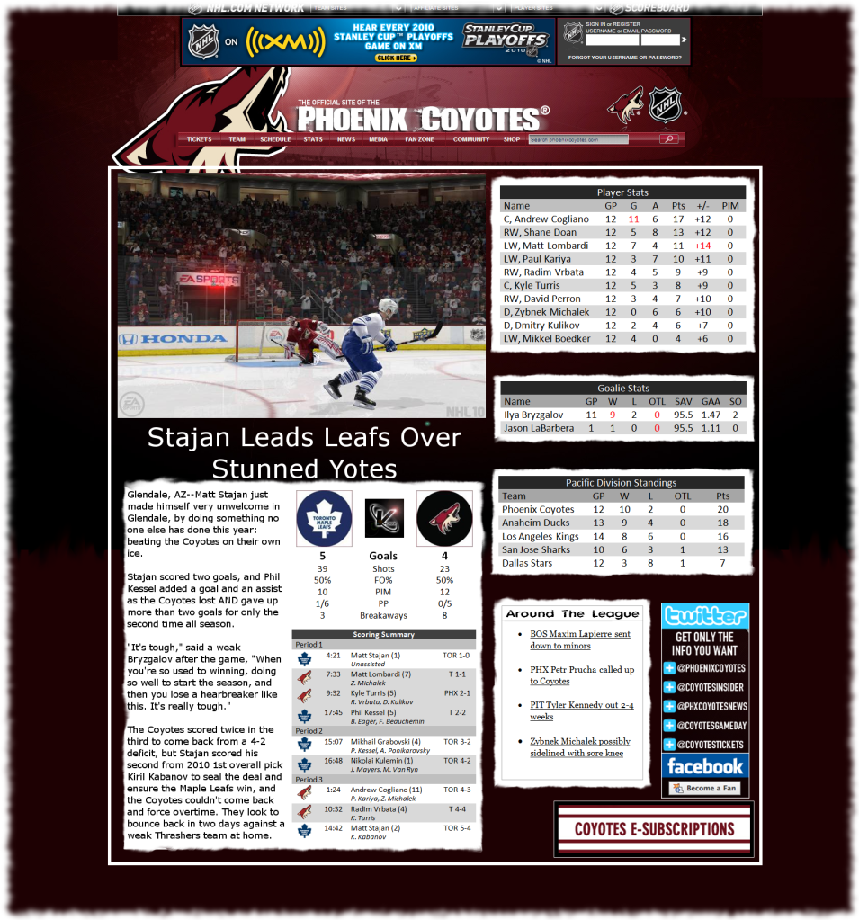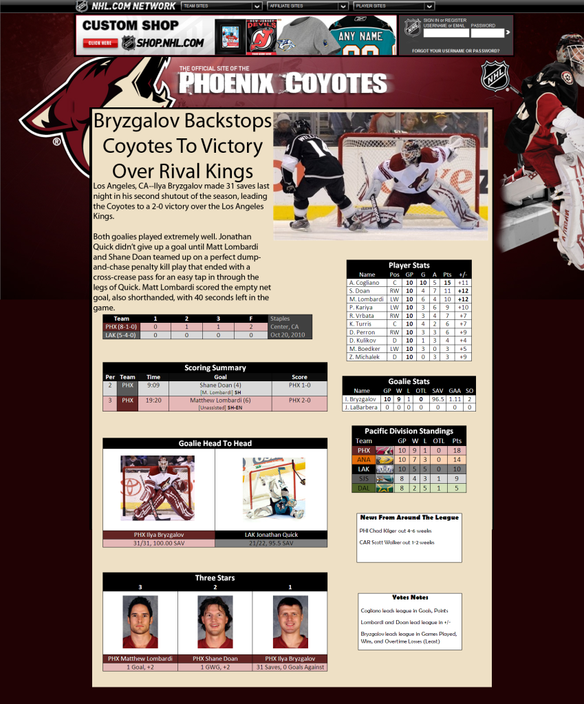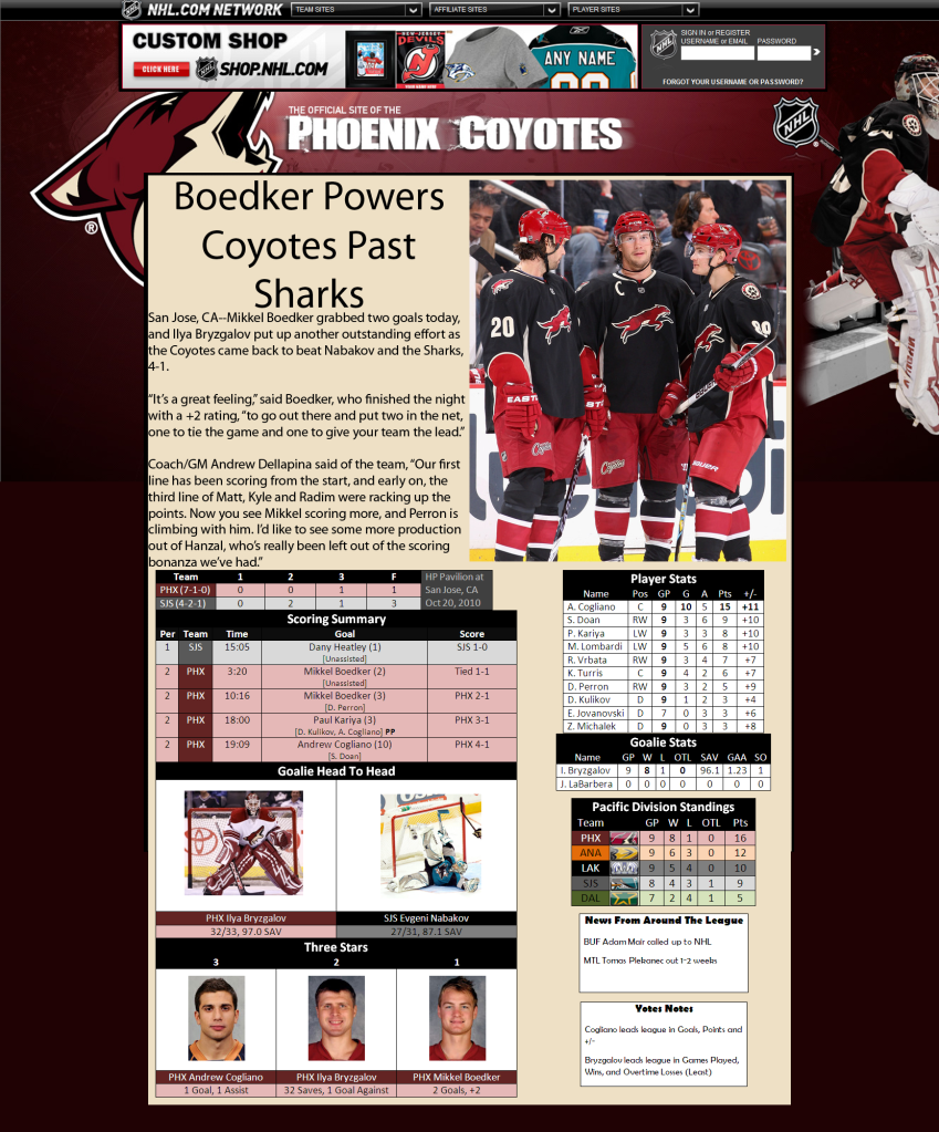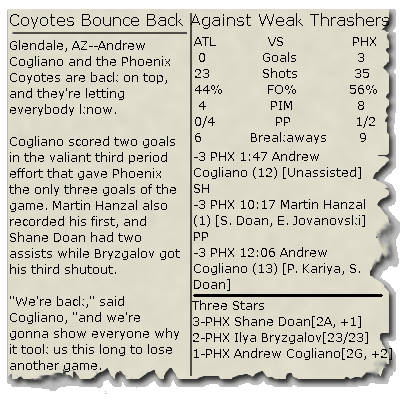 The past few games have been fairly close, but Bryzgalov has just been too good, and I manage to score on some fantastic plays. The games have been getting closer each time--last time I scored the second goal on an empty net, so it was really a one goal game.