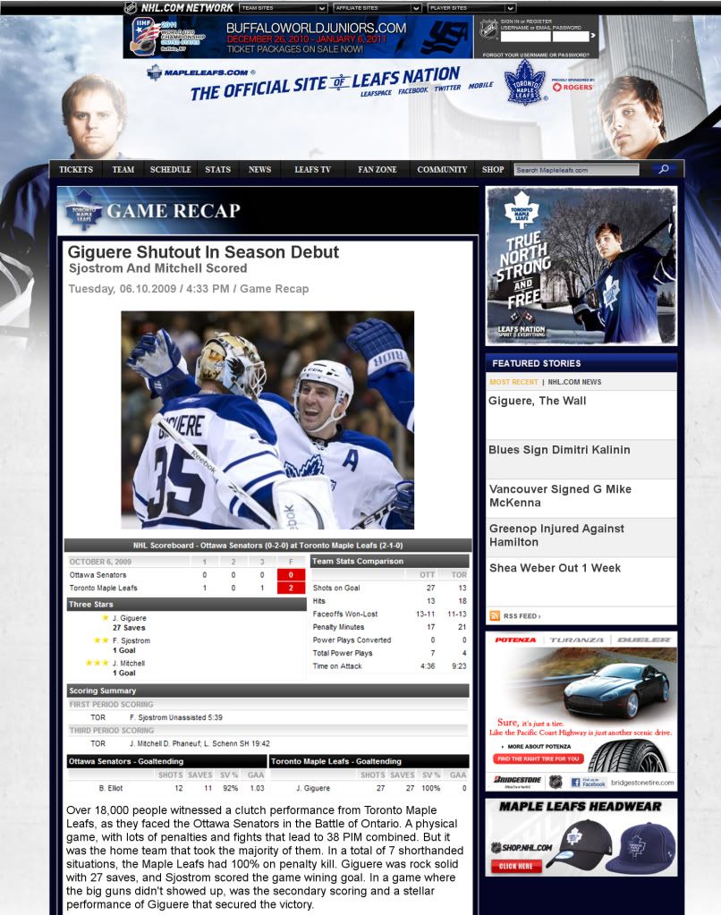 Fredrik Sjoström scored his second goal in two games, since he was changed to fourth line. Giguere had a bad game with only 71 SV%, and Gustavsson is expected to start next game.