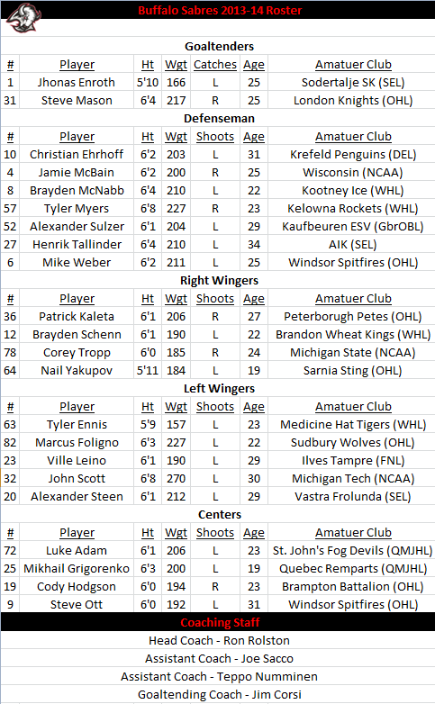 The Sabres official defenseman are: Christian Ehrhoff, Jamie McBain, Brayden McNabb, Tyler Myers, Alexander Sulzer, Henrik Tallinder, and Mike Weber.