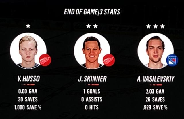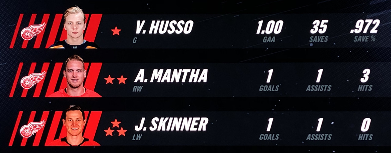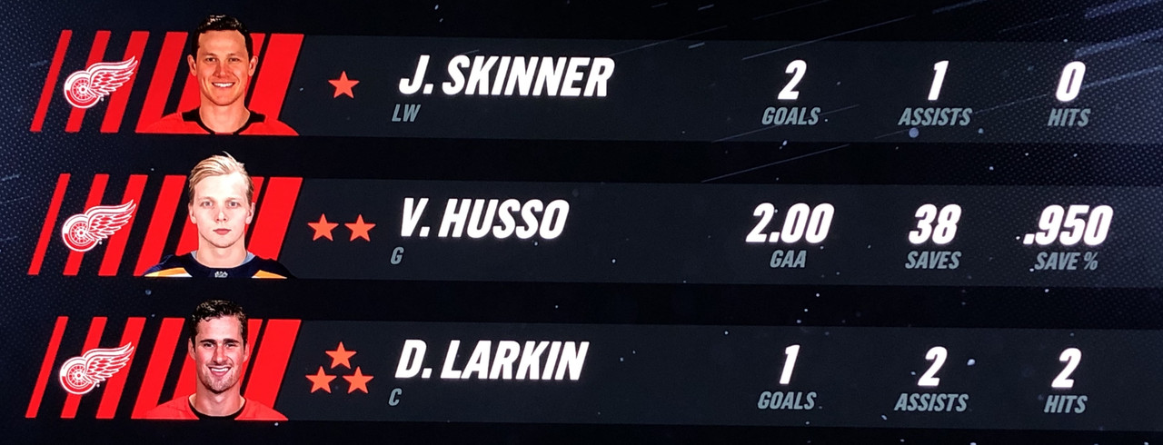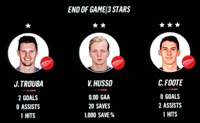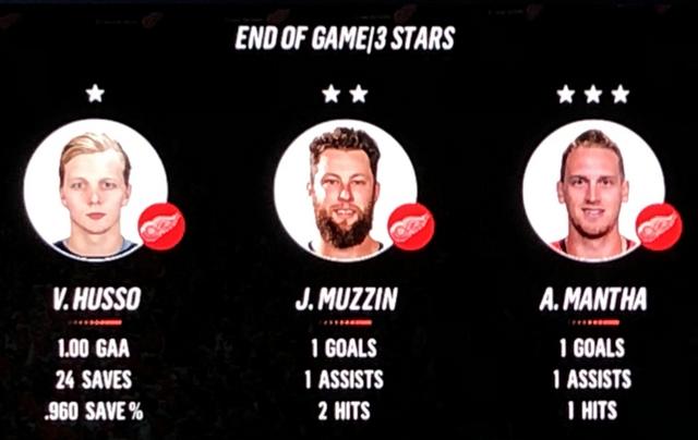 The Stars put plenty of pressure on net, however Ville Husso & the Wings defense kept their nerve, winning the game, making 35 saves.