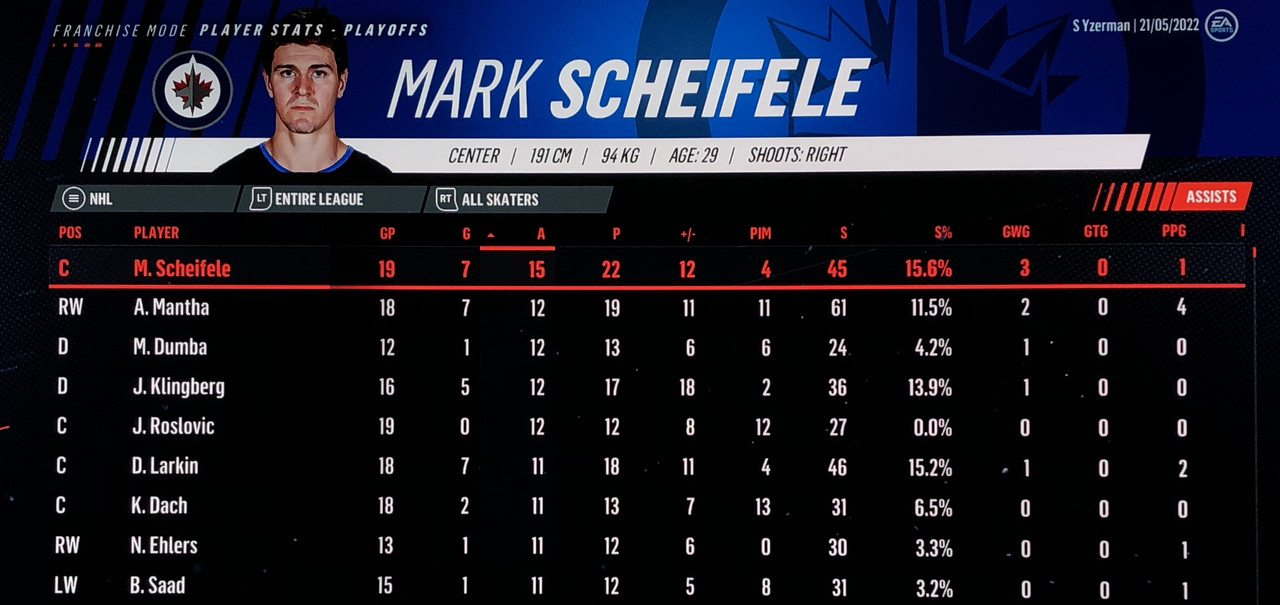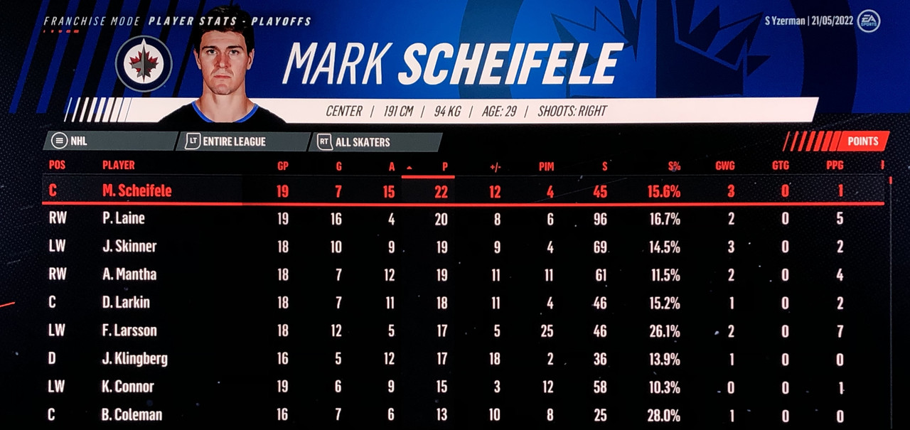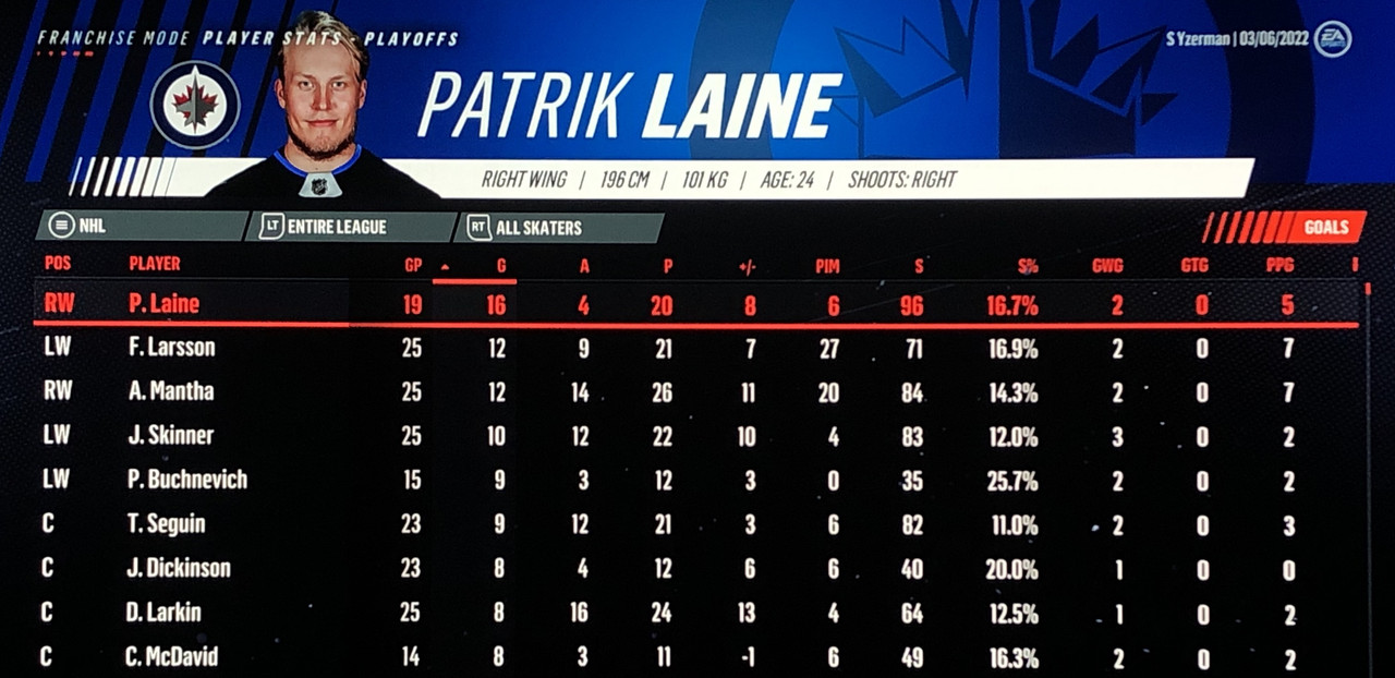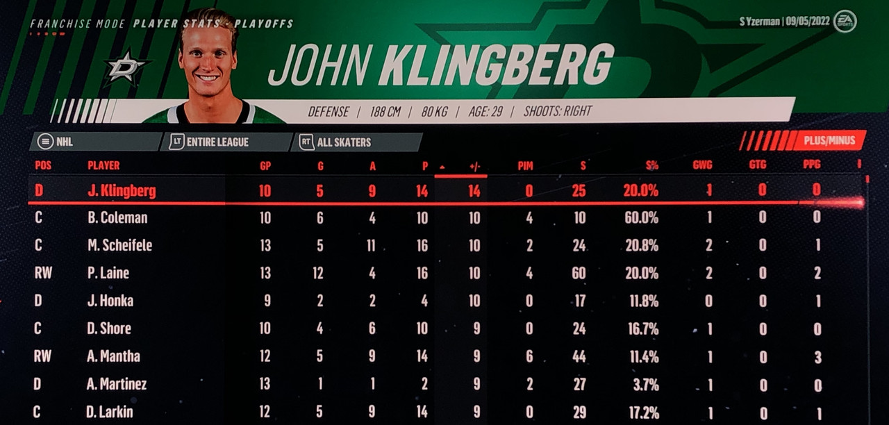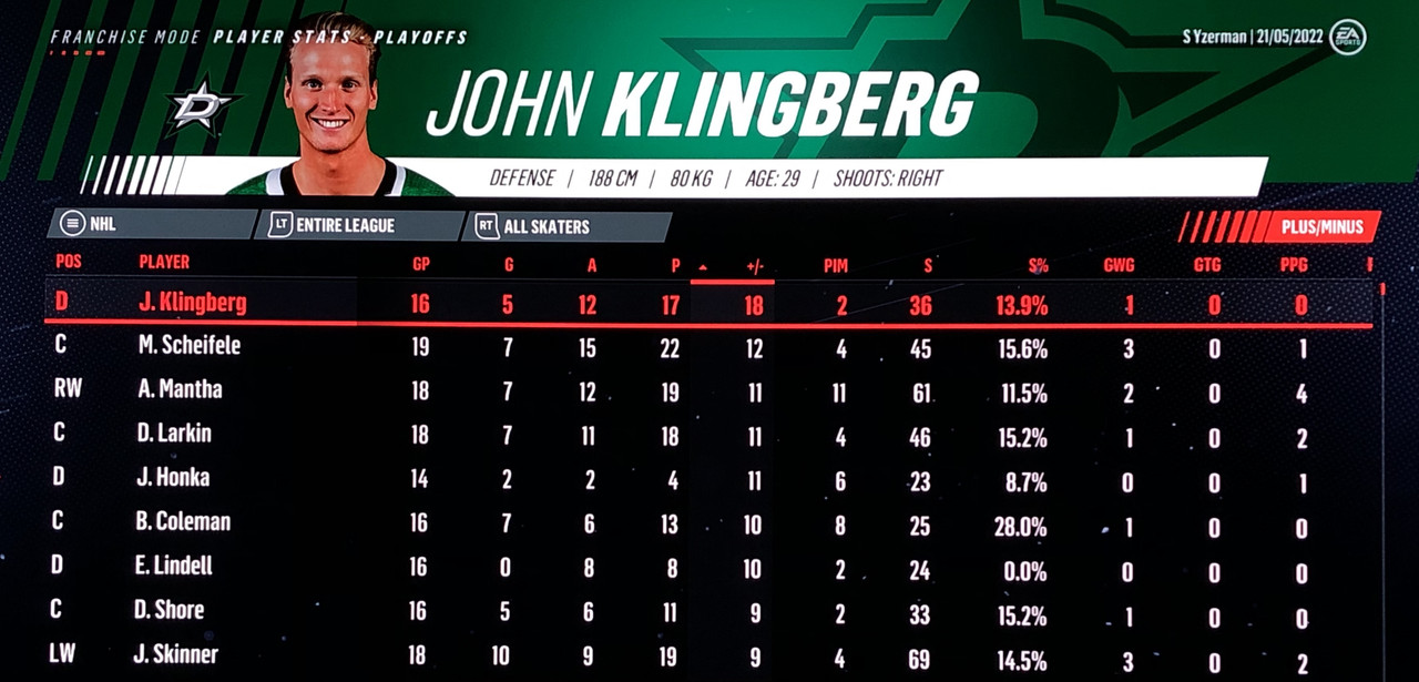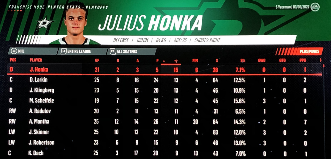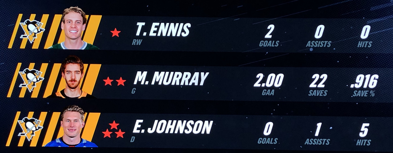 (Honestly this was a great game to play. The scores were locked at 0-0 after 2 periods, both teams had their chances, both with 16 shots on net. Then Trouba scored early in the 3rd to take the lead, but Dallas kept pressing and even in the dying minutes, it looked like they might tie the game – like this game is insufferably ominous for - lol. It wasn’t until Bertuzzi scored his empty netter with 11 seconds left, that the pressure was finally off. It was one of the more enjoyable / high pressure / close games I have played – win or lose. Probably would have cried if I lost :P )