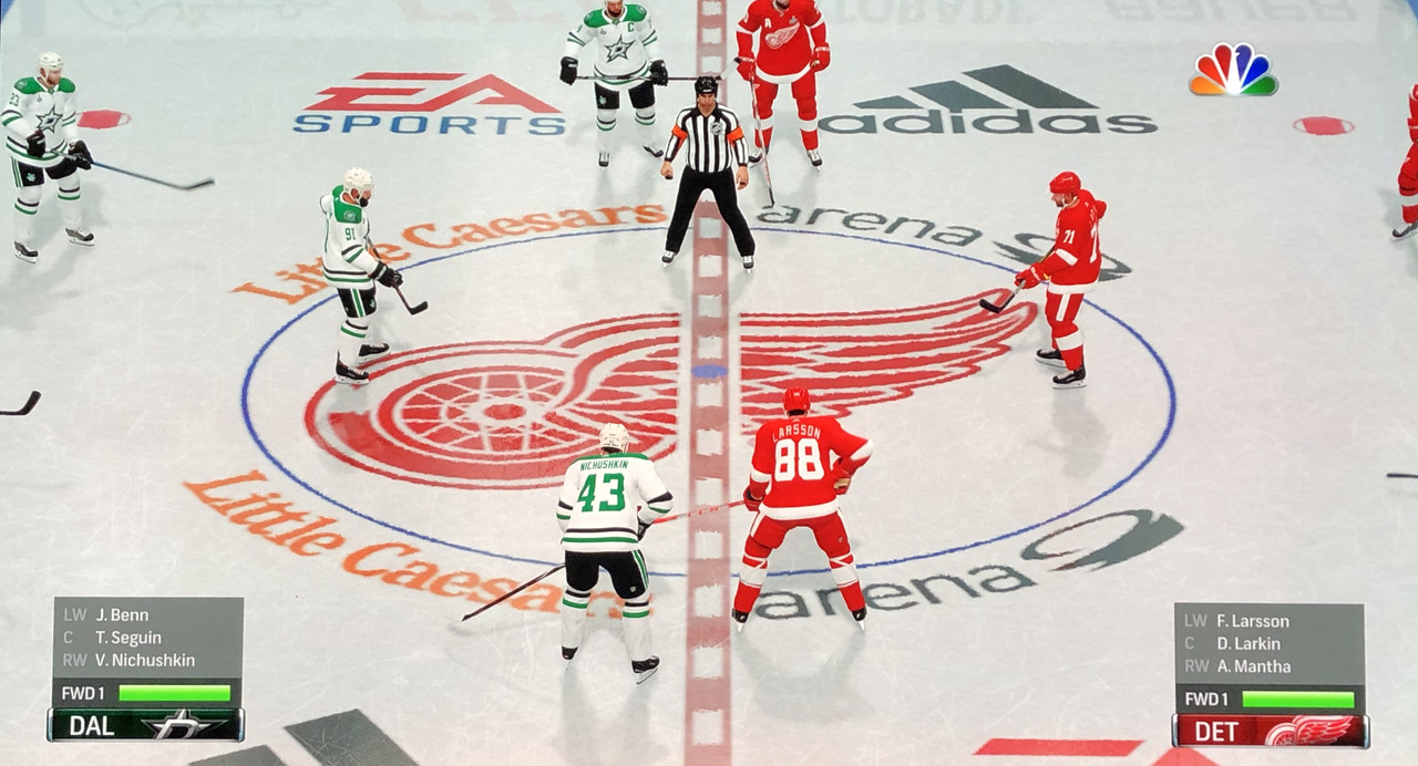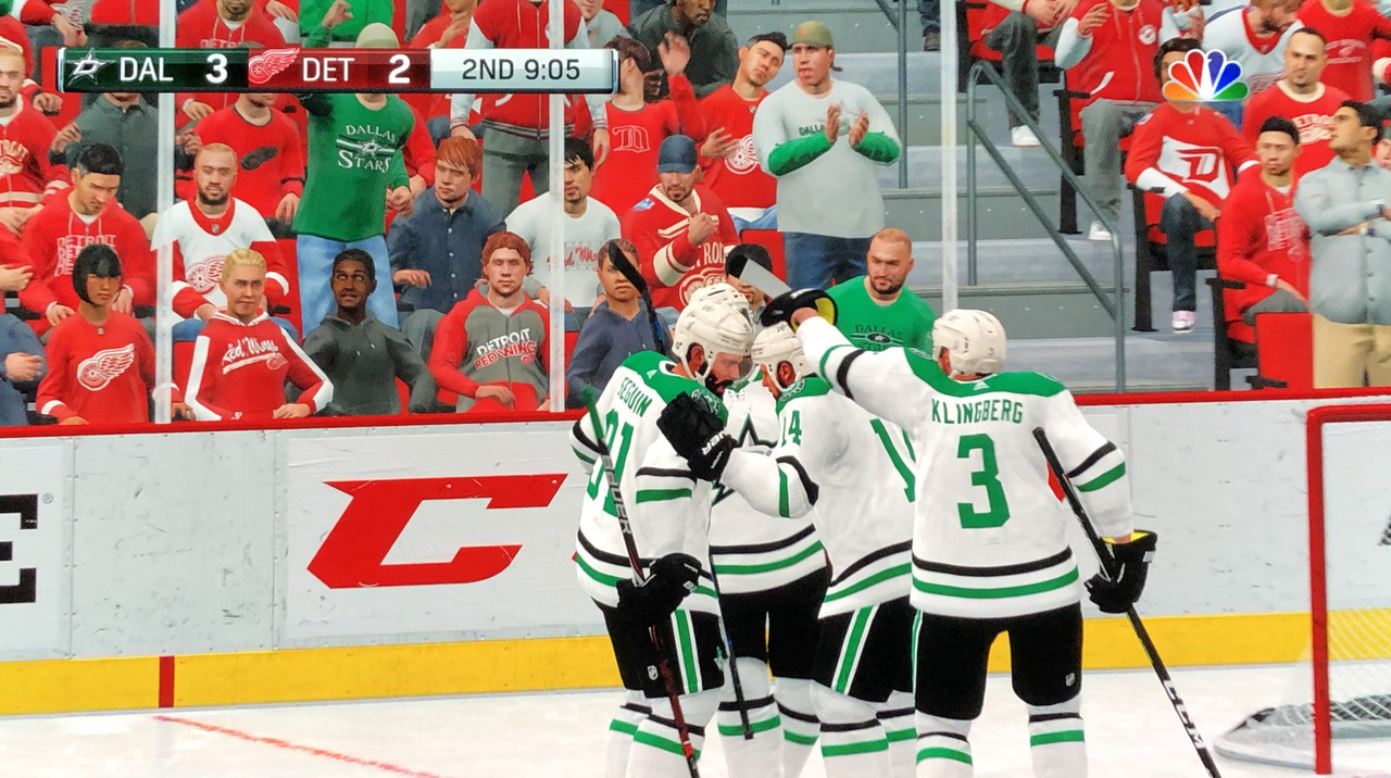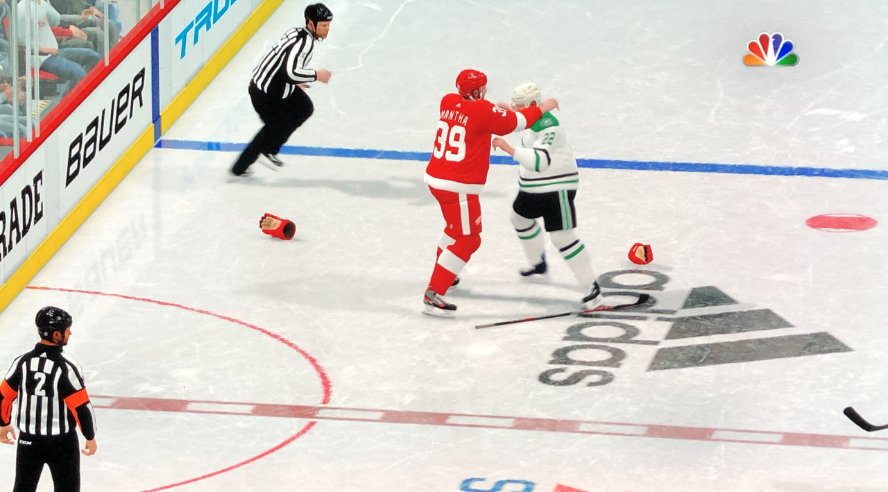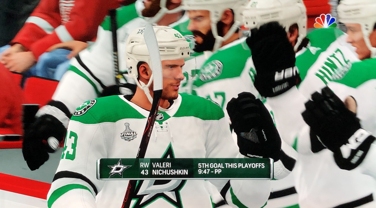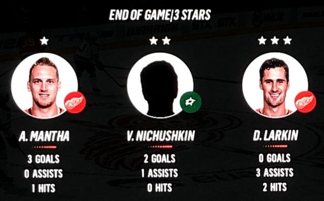 Mantha scored the 1st goal of the game whilst on a power play, however only minutes later, the Red Wings drew 2 penalties, giving the Stars a 5-on-3 powerplay, Stars forward Valeri Nichushkin capitalised on the Wings sloppiness & scored twice within a minute to put the Stars in front 2-1, which carried into the 1st break.