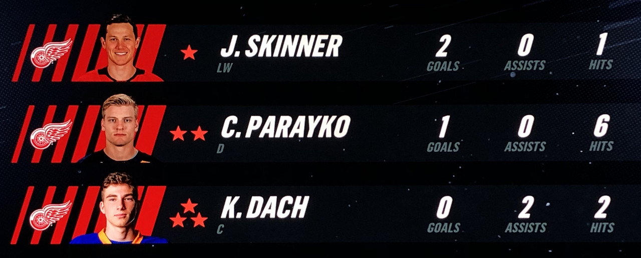Zadina, Svechnikov, Dach & Frk were Detroit’s goal scorers, with Zadina & Dach also tallying an assist each.