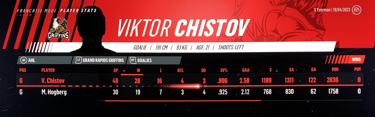 Up & coming goalie, Viktor Chistov ran hot & cold this season, at one point winning 10 games in a row, however almost completely undoing that feat later by losing nearly the same amount before snapping the streak.