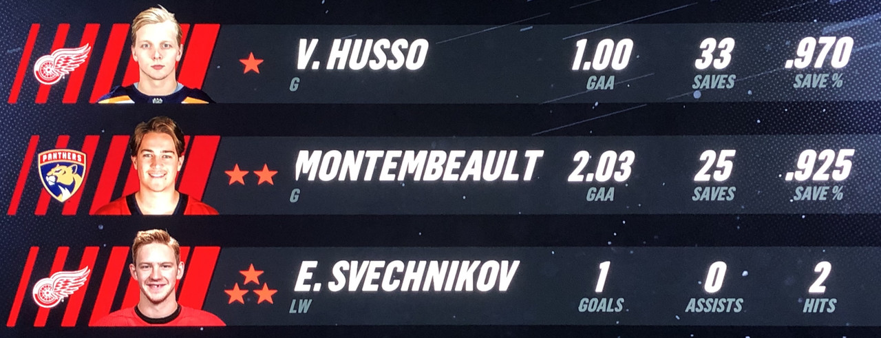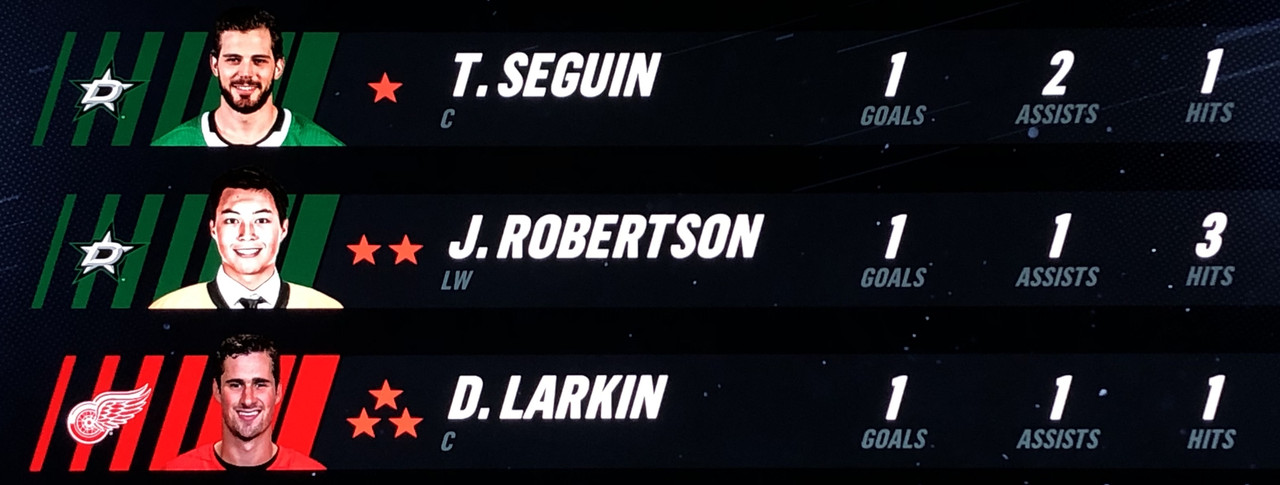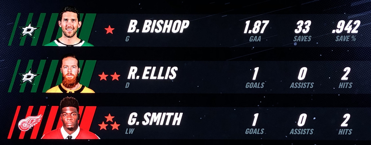Red Wings’ Ville Husso was busy tonight, facing 40 shots. Husso made 37 saves in the loss, whilst Stars’ Ben Bishop made a great 33 saves to notch a win.