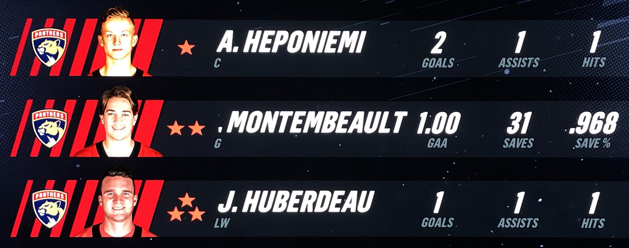 The Panthers struck back in the 2nd period with goals from Defenseman Michael (not George) Matheson & Aleksi Heponiemi to take the lead for albeit a brief time until with 3:01 remaining in the same period, Shea Weber broke through to score & tie the game.