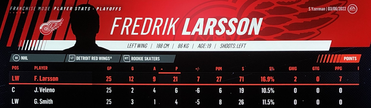 The acquisition of Colorado's 2021 1st Round Draft Pick - When Colorado approached me with the offer of giving them Alex Killorn (who was acquired through the Foote acquisition from TB), plus some minor draft picks, in exchange for their 2021 1st round draft pick, I thought it was a no brainer, however I had no idea how that acquisition would play such a pivotal part in this team's rebuild. We had no indication that Colorado would have such a poor season in 2020/21 & suddenly here we were with pick number #1 & the ability to pick the most sought after rookie in Fredrik Larsson. Although Freddy went quiet in the Cup final series, he is the major stepping stone to this teams success this year & in years to come.