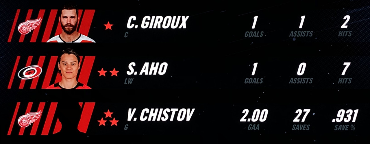 The Red Wings had a great run during the 1st period, scoring 3 unanswered goals by Dach, Larsson & Josi, which ultimately set them up for the win.
