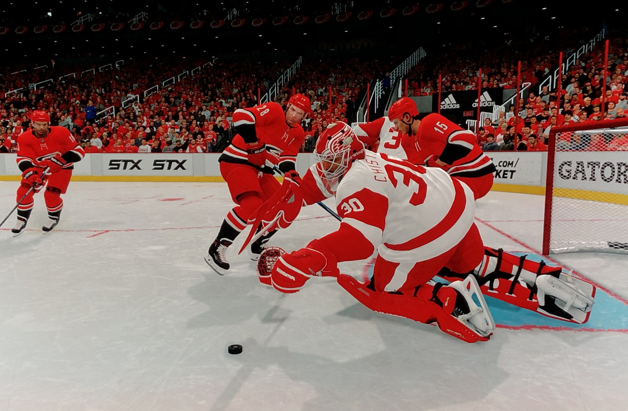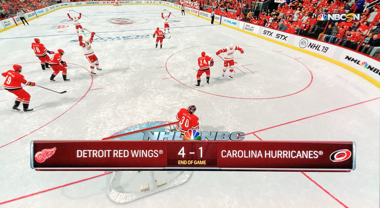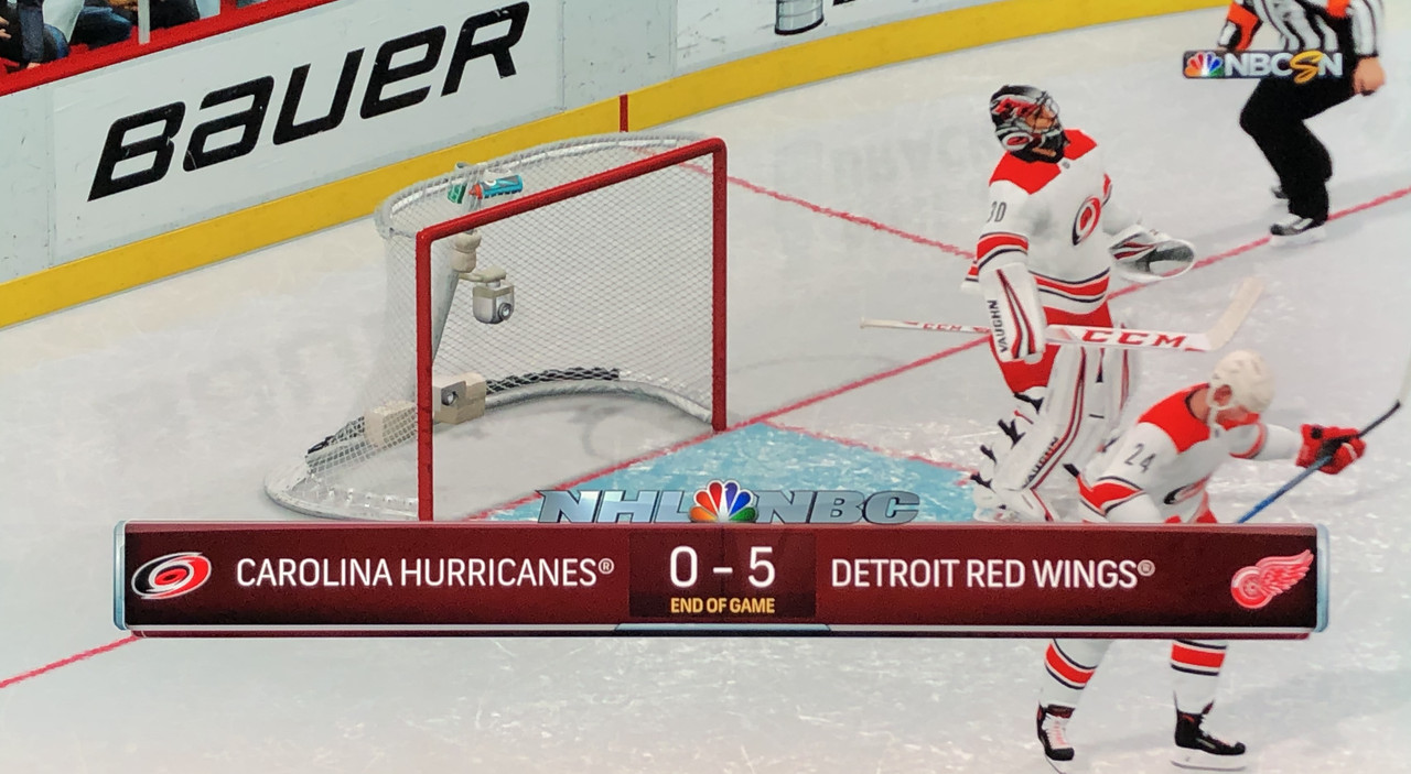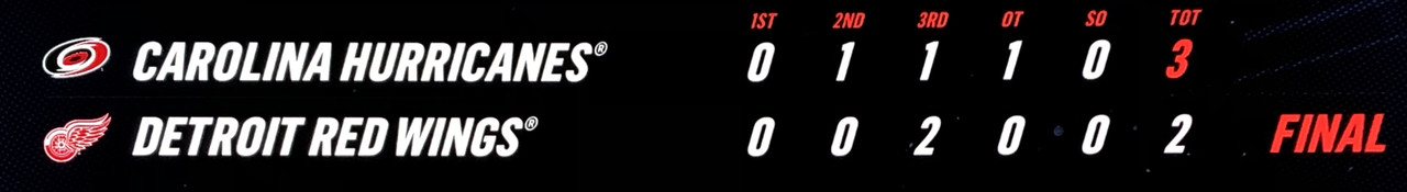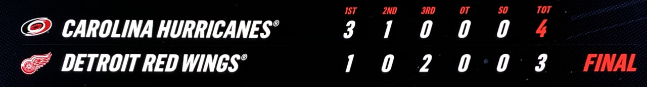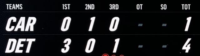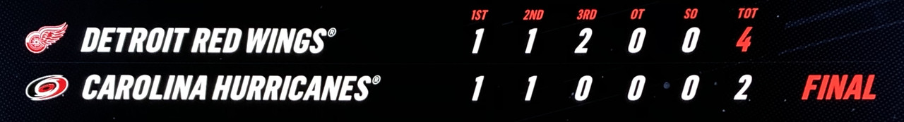 The Canes pulled Nedeljkovic with a minute remaining in the 3rd, however the manoeuvre backfired when Wings d-man Jaylon Legace deflected the puck off the boards from the Red Wings defensive zone that trickled into the net.