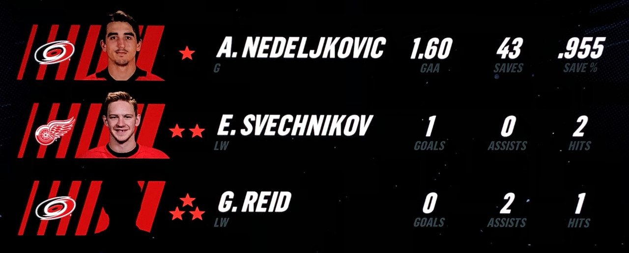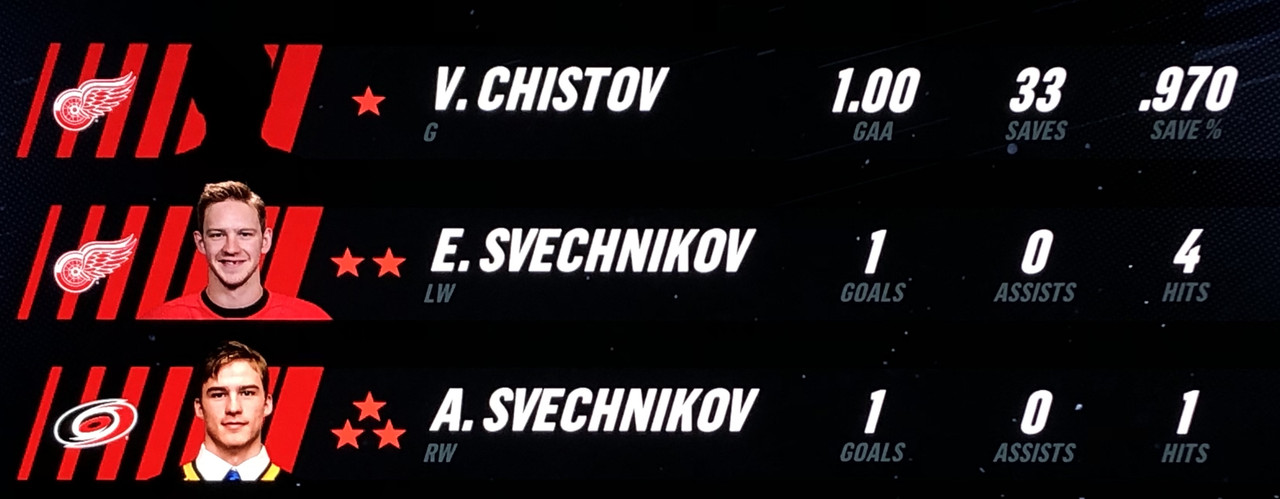 It started with Red Wings’ Evgeny Svechnikov scoring the tying goal to force overtime late in the 3rd period. Followed by Hurricanes’ Andrei Svechnikov scoring the game winner with 15 minutes expired during the extra time period.