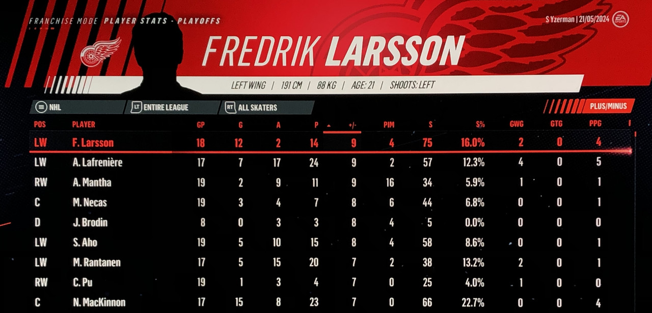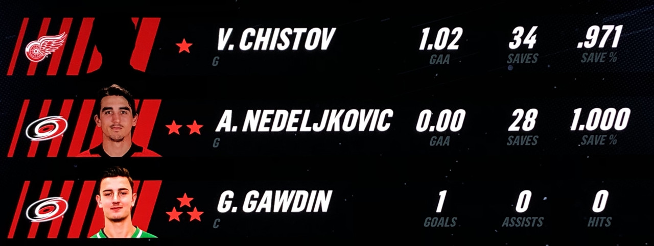 Fredrik Larsson scored twice for the Red Wings as they tried to close the gap however Canes goalie Alex Nedeljkovic, was too good tonight, as he has been all season.