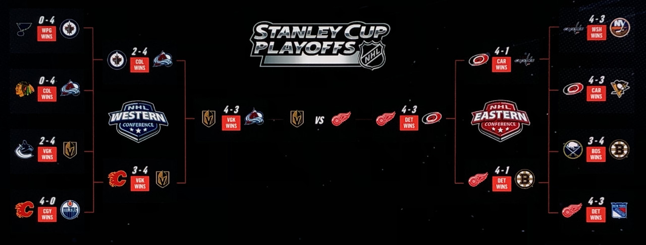 Another series in the bag & the Red Wings were put to the test by Carolina, one of the best young teams in the league along with ours. After losing Games 1 & 2 at home, our team were able to turn the tide on the road & tie the series. They were then tested even further when we lost Game 5 at home, putting us on the verge of elimination. We finally found our groove in Game 6 pulling off another win on the road & then finally won a home game in Game 7 to advance.