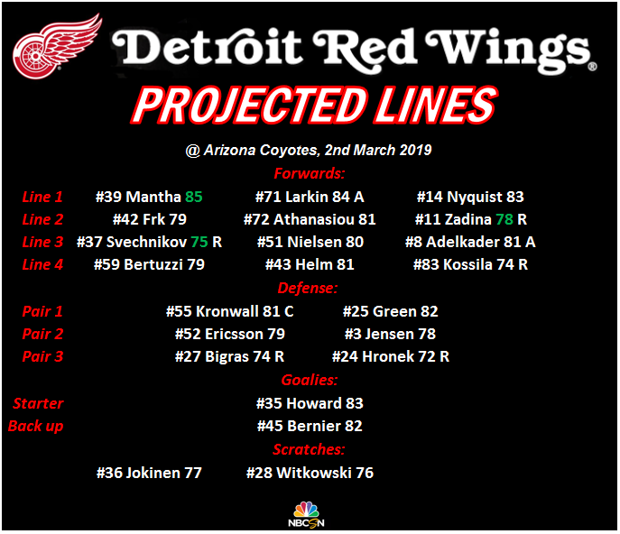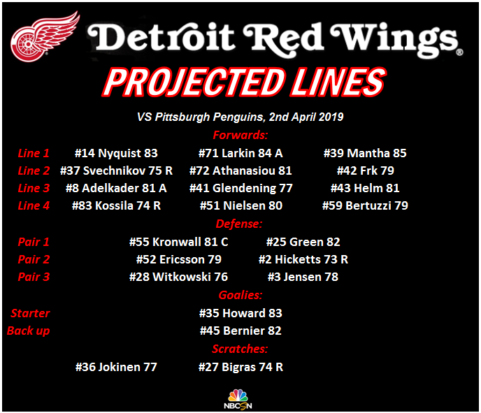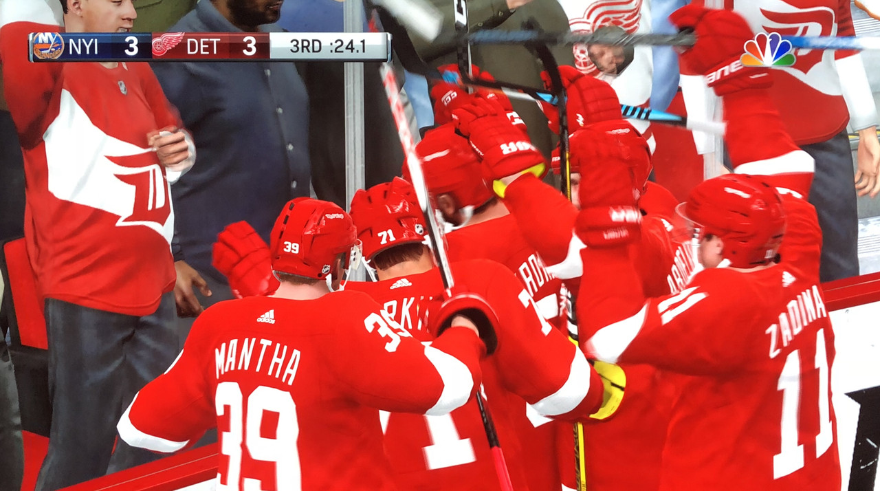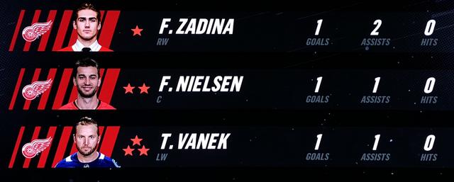 Filip Zadina tallied a goal and 2 assists, Mantha tallied 2 assists, and Larkin, Nielsen & Vanek each tallied a goal and an assist each.