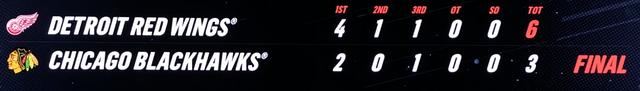 A 4 goal run in the first 11 minutes of the 1st period has propelled the Red Wings to a convincing 6-3 victory over the Blackhawks.