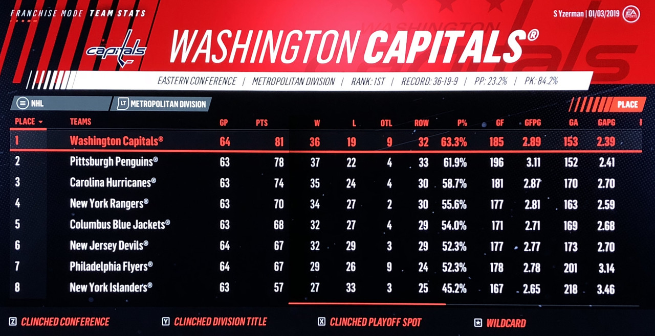 New York currently hold a 1 point lead (89pts) over New Jersey (88) & Carolina (88). If they win their game against Pittsburgh, they are automatically through. Should they lose, they must rely on both teams losing their games.