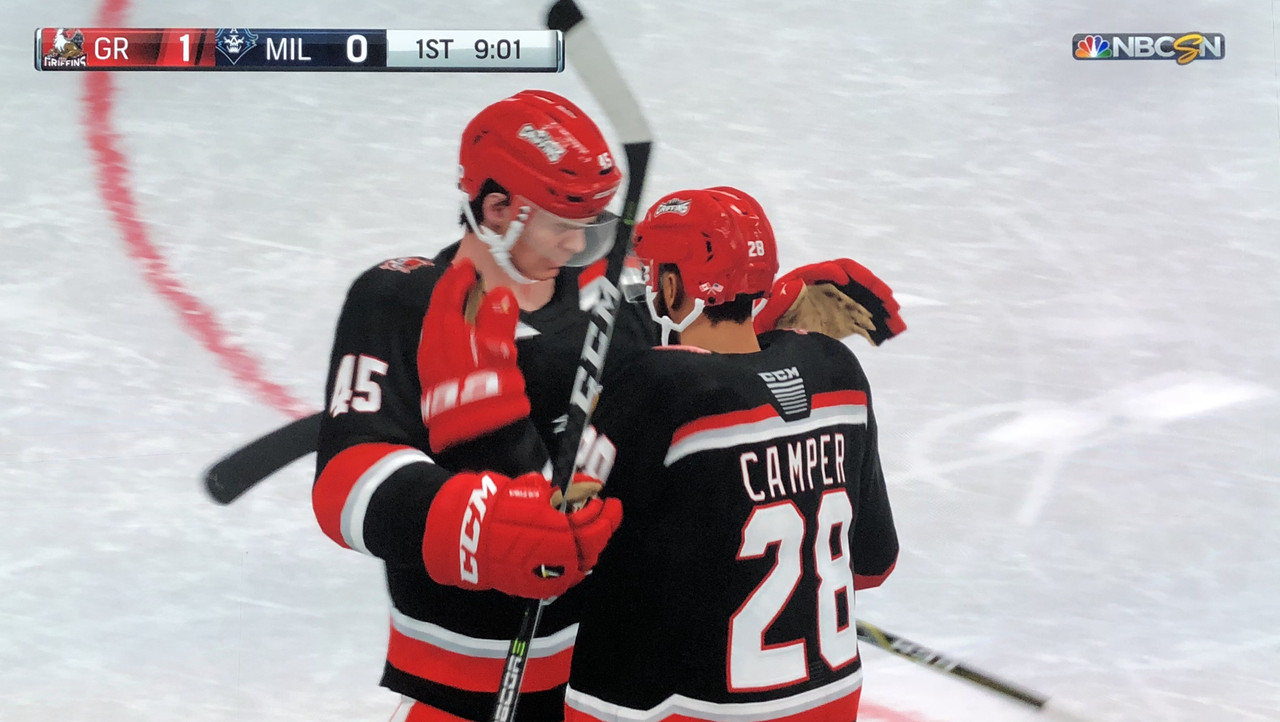 Griffins center, Carter Camper scored in the 1st period to put the Visitors in front briefly, however a goal from Zac Rinaldo 4 minutes later tied the game at 1-1