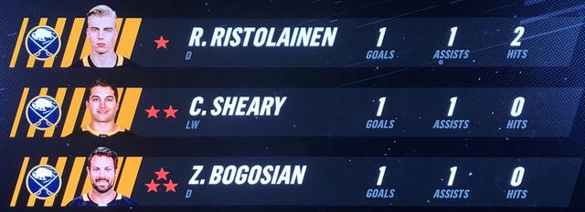 Sabres’ Jason Pominville scored in the 1st period with the rest of the game going without further score until Sam Reinhart flicked in an empty netter with 0:39 seconds remaining on the game clock.