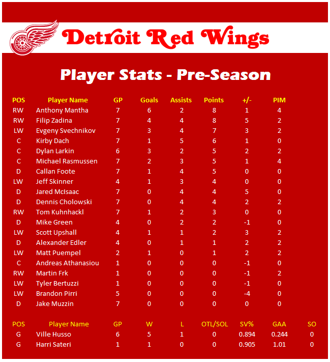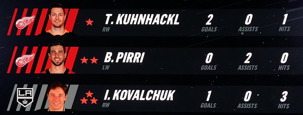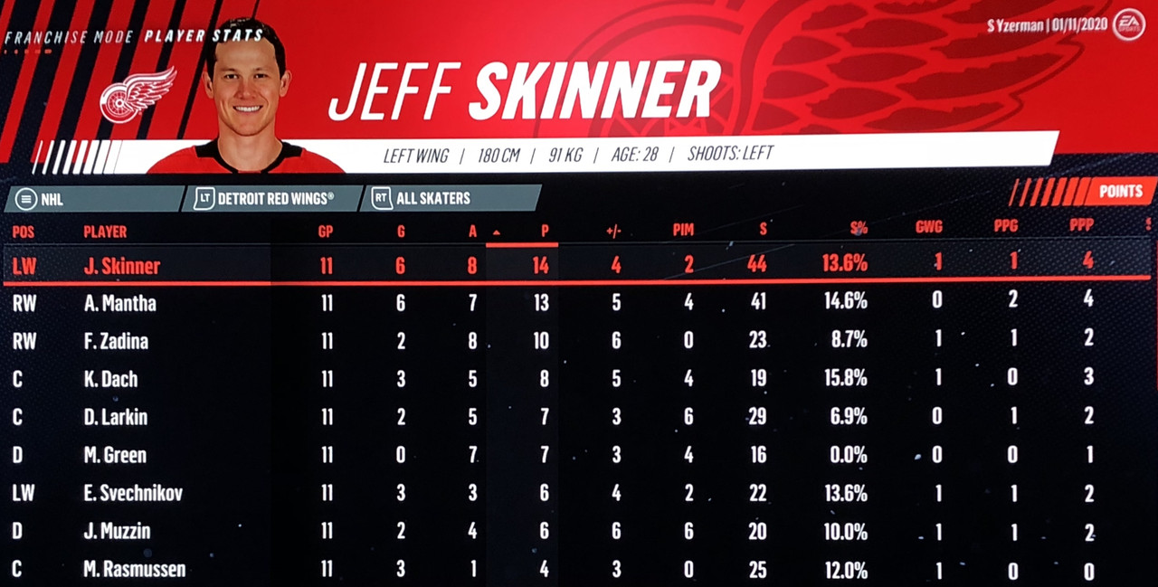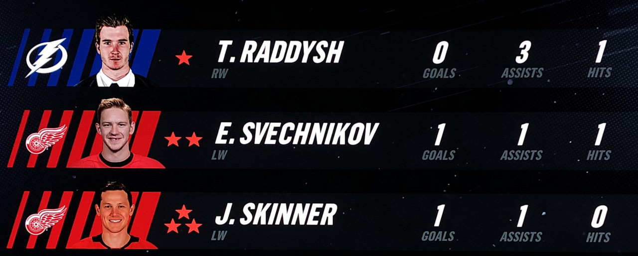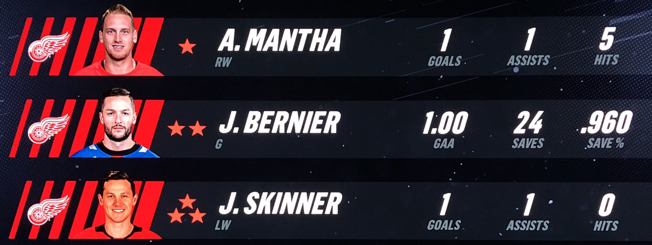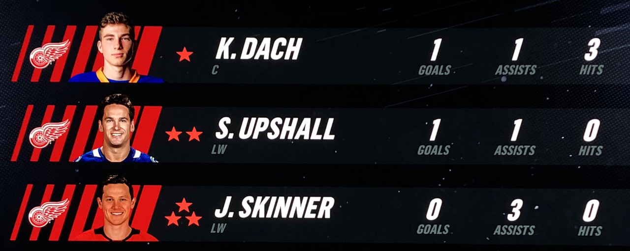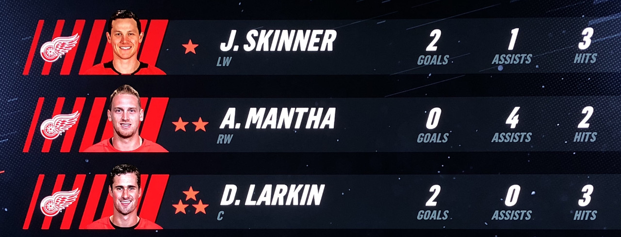 Jeff Skinner & Dylan Larkin both scored twice in tonight’s big win & Anthony Mantha contributed tallying 4 assists, which was great to see the 1st line contributing.