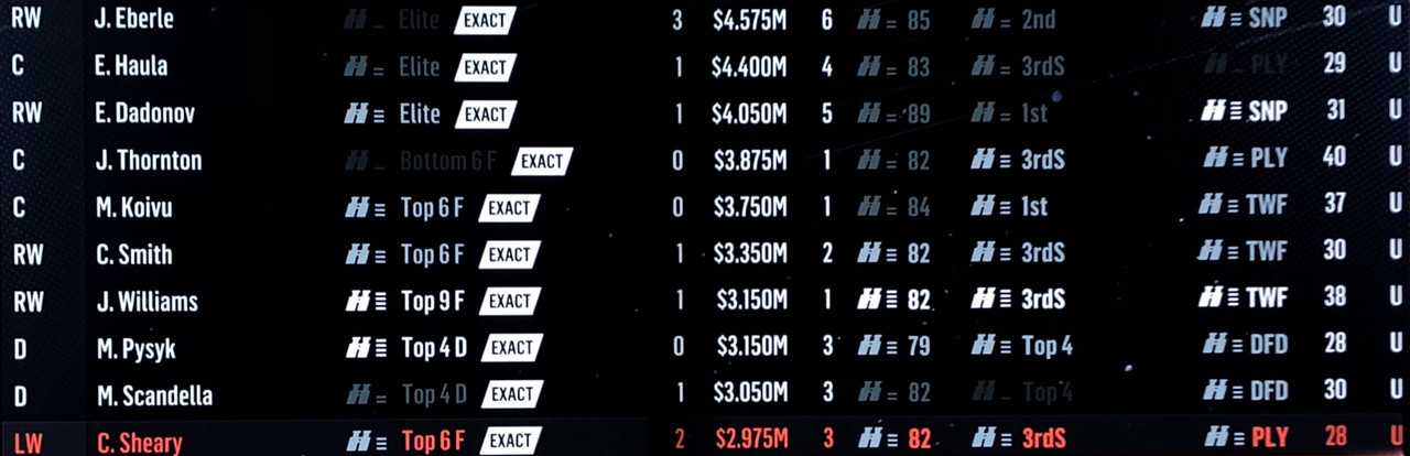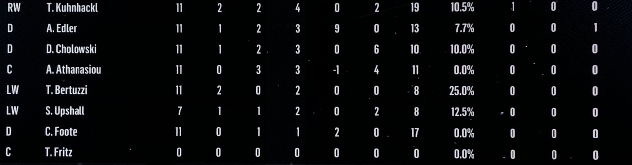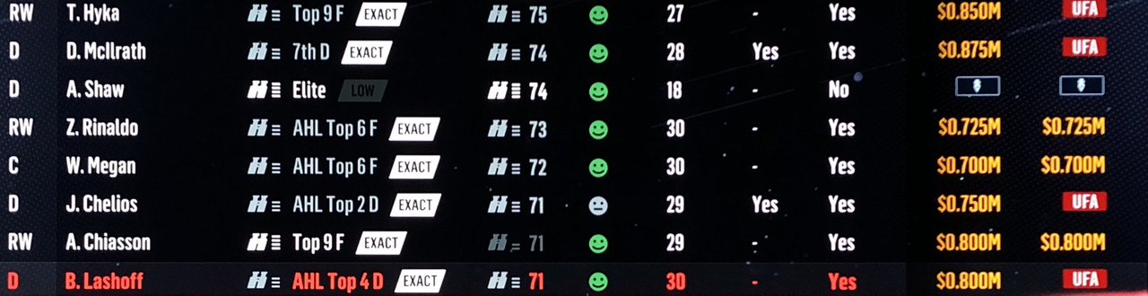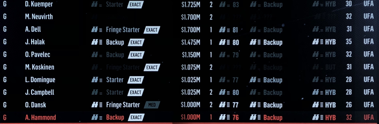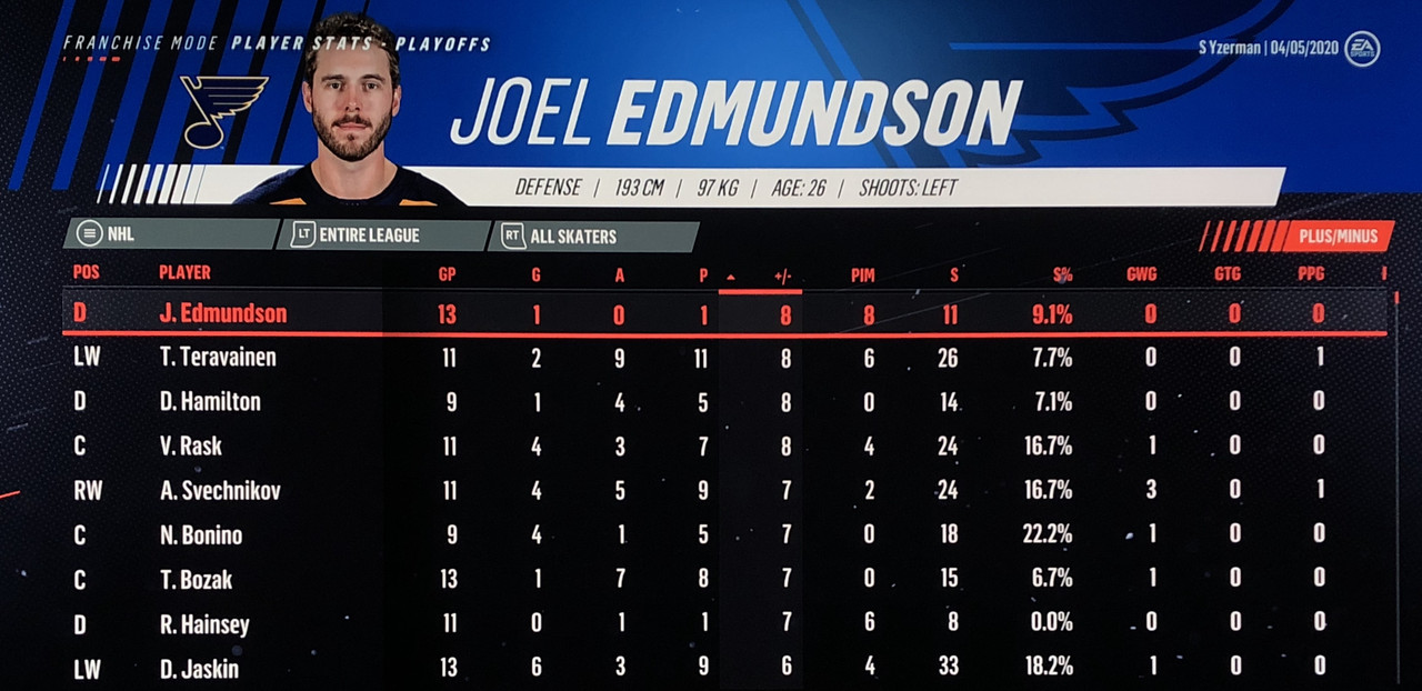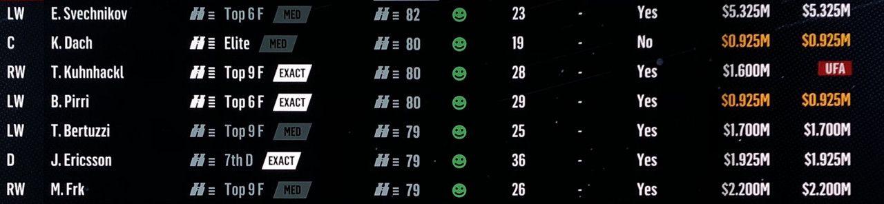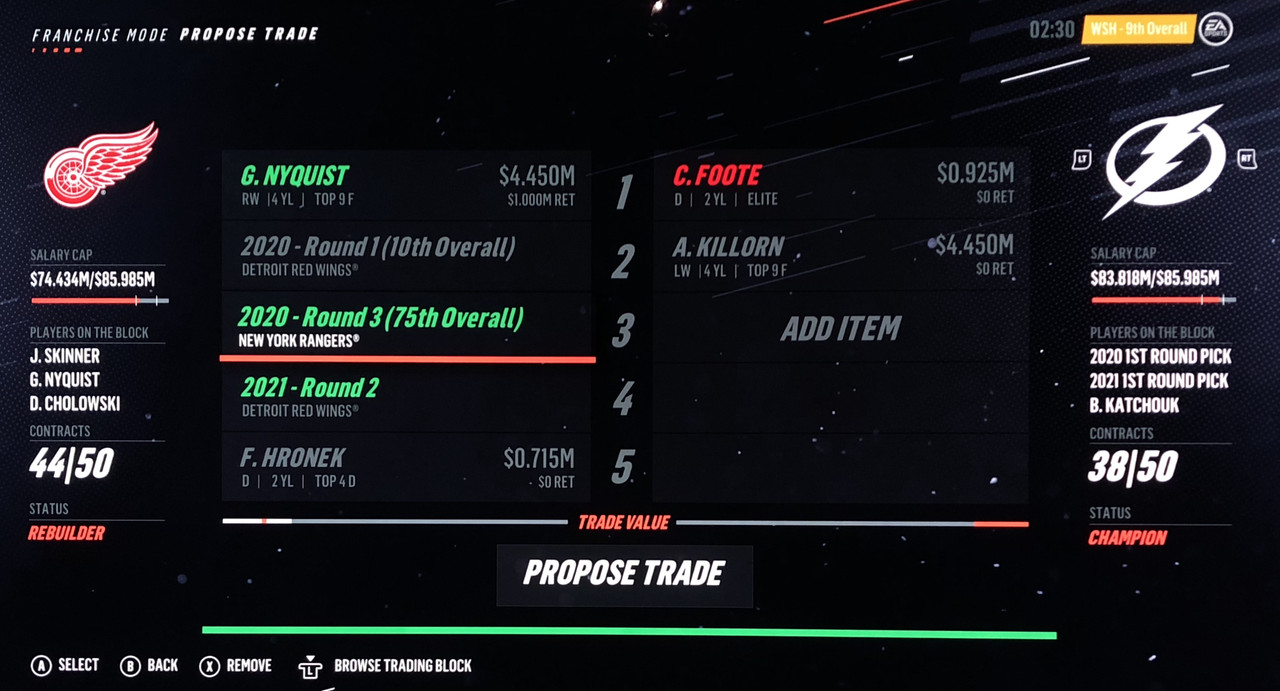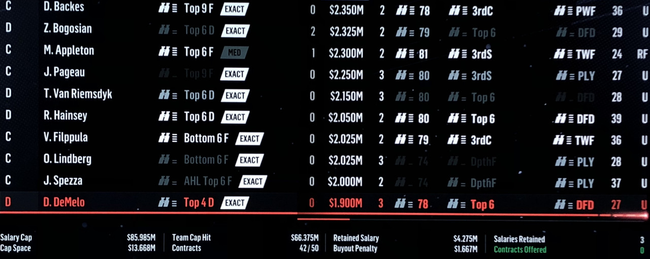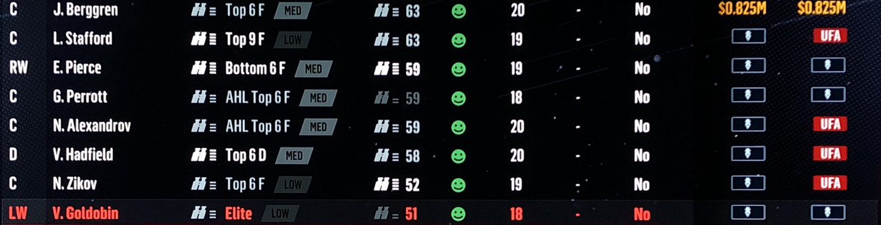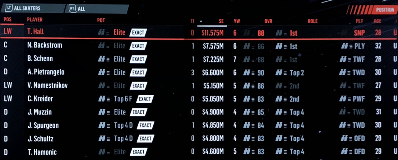If we keep winning, my thoughts are to trade early, say around November or December. The 2 regular roster guys I have in mind are Andreas Athanasiou (which sucks because I’m a huge fan in real life) &/or Alex Edler, both of whom could make up the lion share of a deal & I think the team would still have the depth to cover the loss of them.