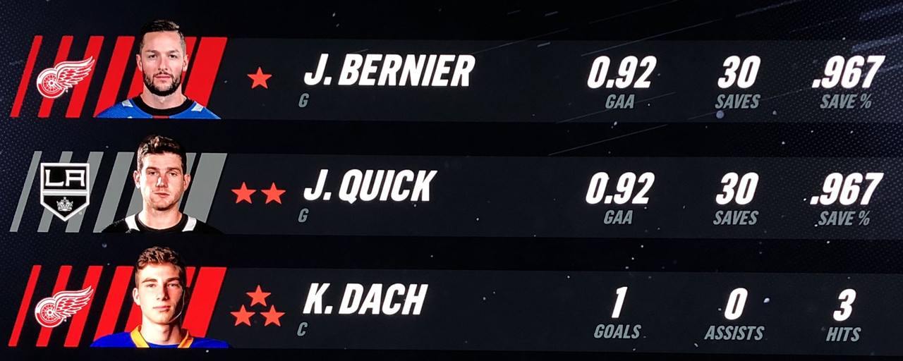 Full credit to both goalies tonight. Both Quick & Bernier stopped 30 shots on goal each.