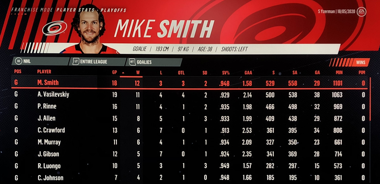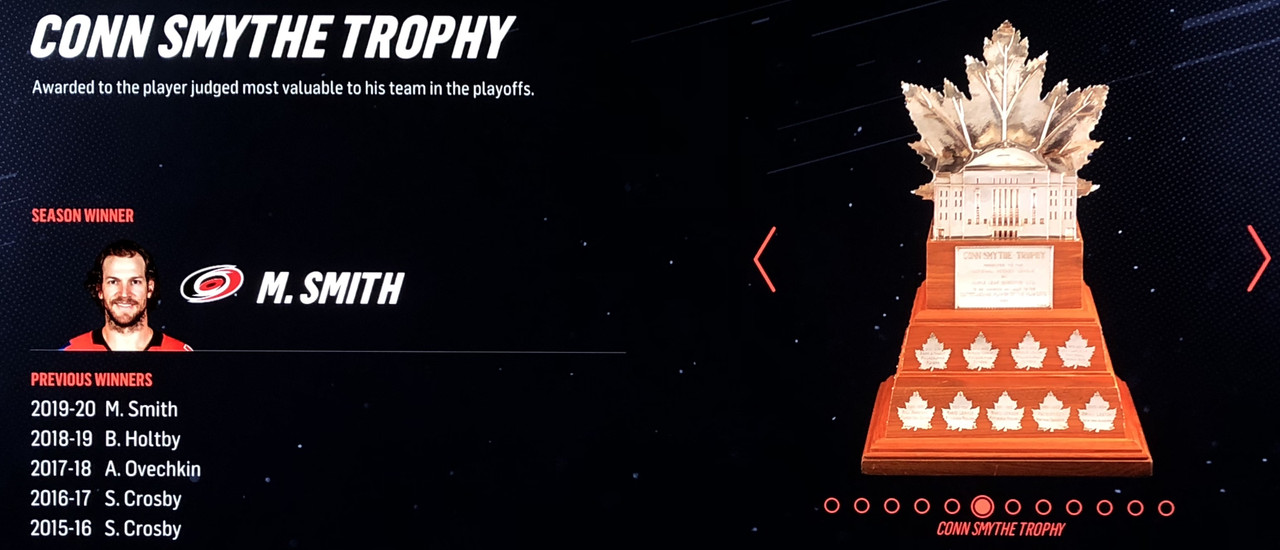 The Conn Smythe Trophy is awarded to veteran goalie, Mike Smith, with an impressive .947% save percentage & 1.61 Goals Against Average (GAA).