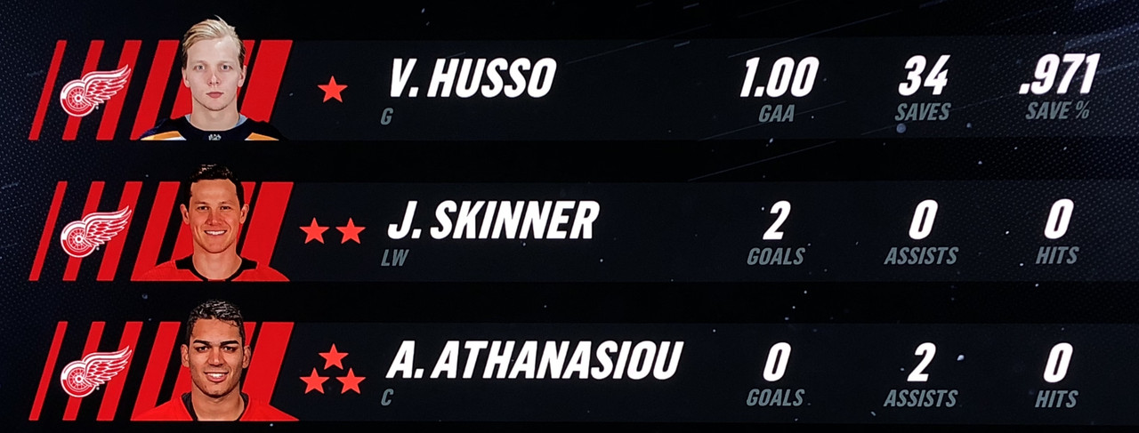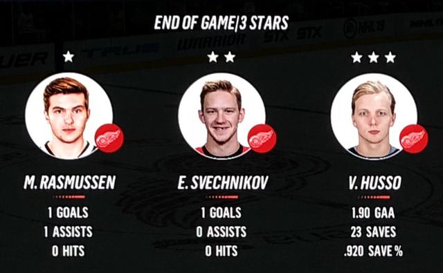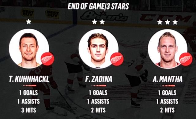 Rookie goalie, Ville Husso pulls out his 2nd win from consecutive games, tonight making 24 saves from 27 shots faced. Tom Kuhnhackl scored his 1st 2 goals as a Red Wing, pulling off a brilliant game. Anthony Mantha & Tyler Bertuzzi also scored in the victory.