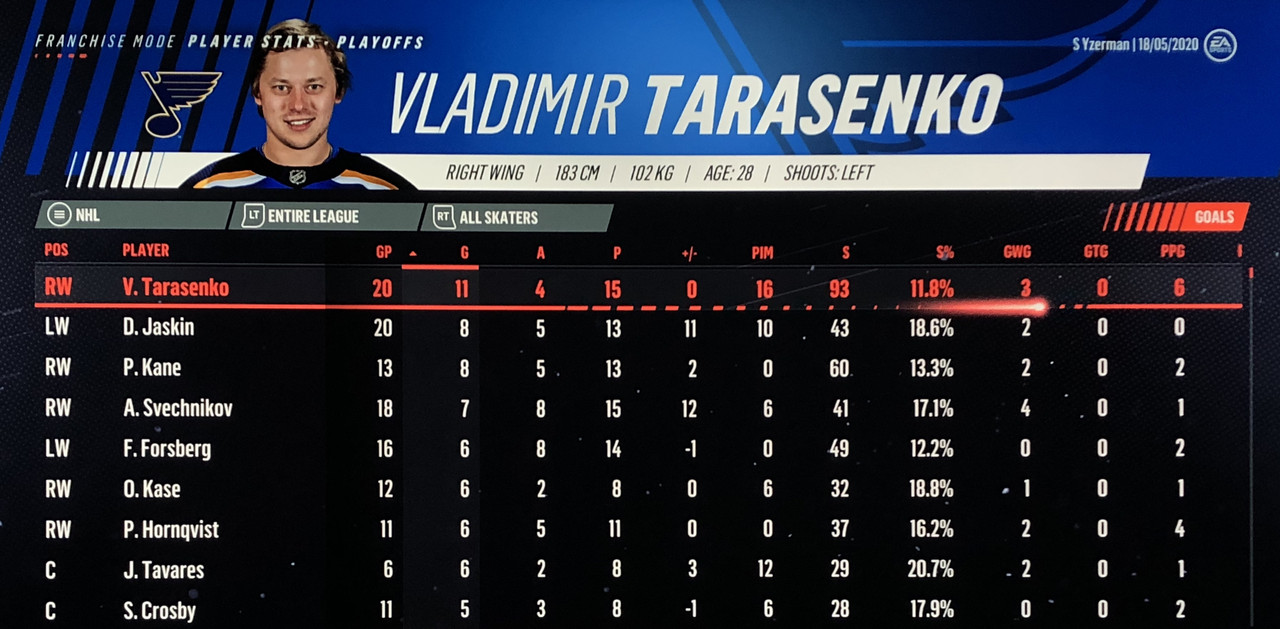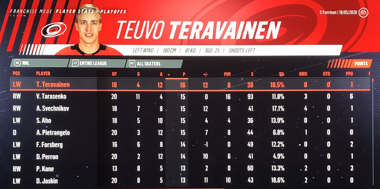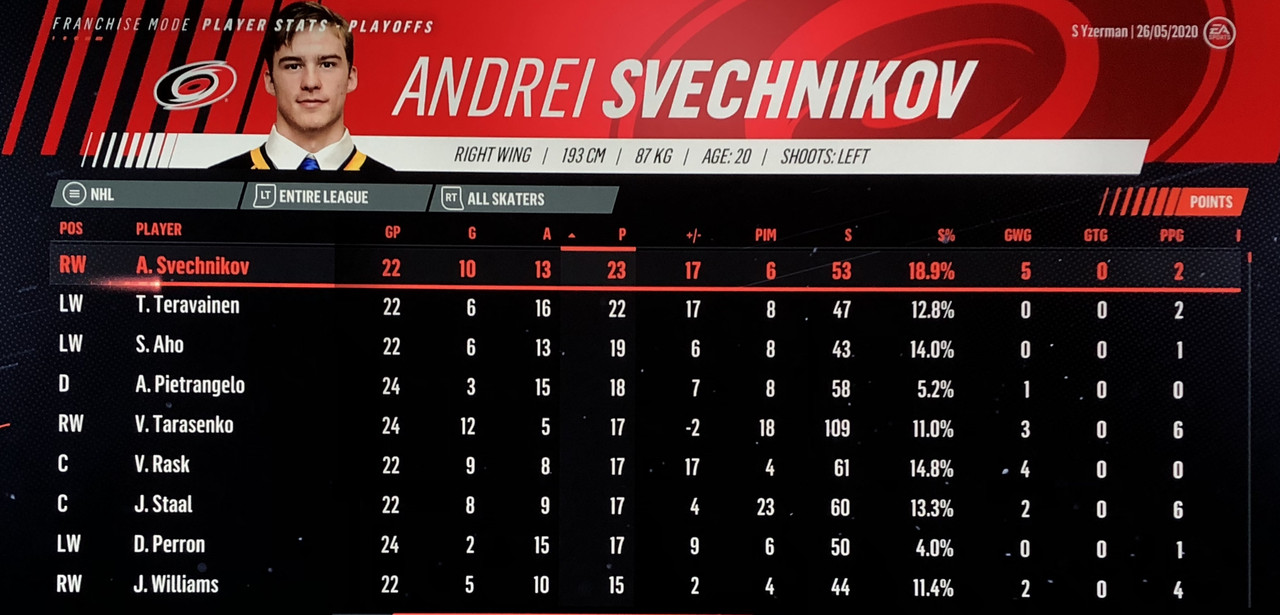 In only his 2nd season in the NHL, Andrei Svechnikov is the top scoring player throughout the entire 2020 finals with 23 points (10 goals, 13 assists) in 22 games. A massive effort & accolade for a gifted young player, an amazing career is still ahead.