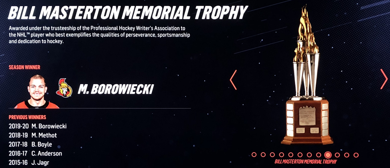 - not sure how Mark Borowiecki wins the award for Sportsmanship when he led the league in penalty minutes for the 2nd year running?!