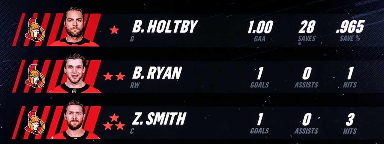 Senators Center, Colton Sissons, scored late in the 1st period to tie the game, however that would be the visitor’s one & only goal for the game, with Ville Husso continuing a fantastic season, making 39 saves on his way to being named the game’s 1st star.