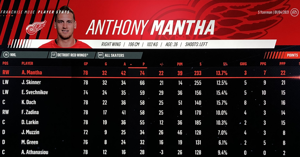 Leading Points: Anthony Mantha - 74