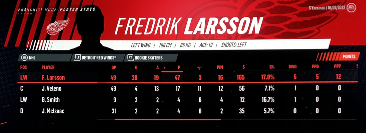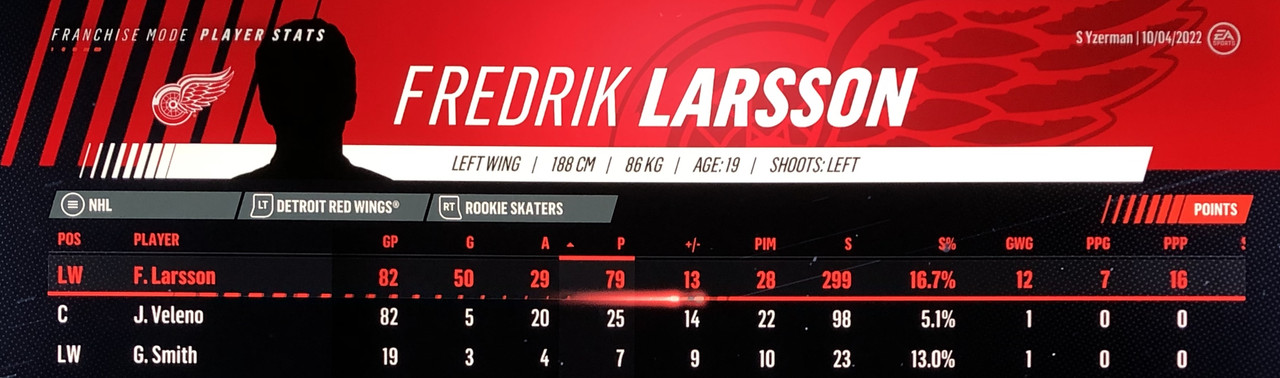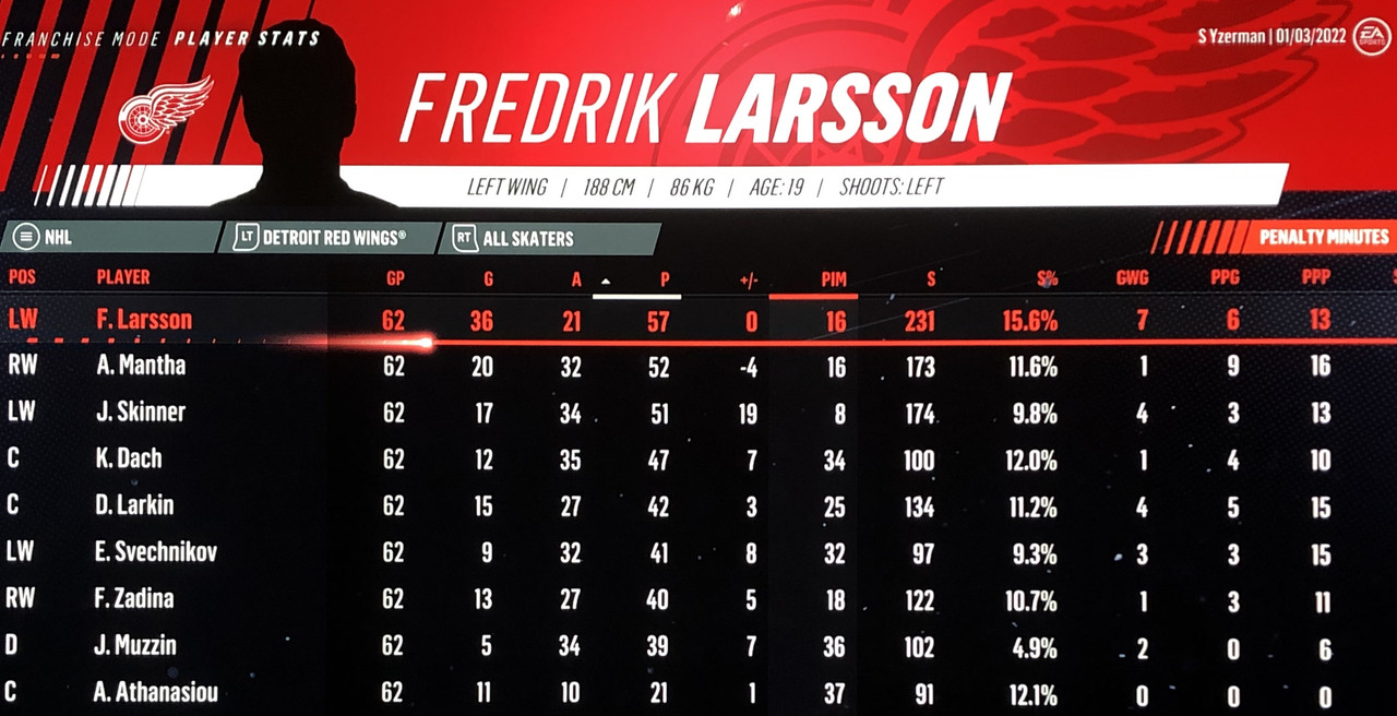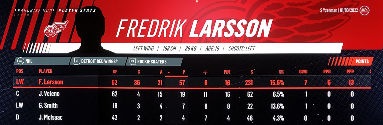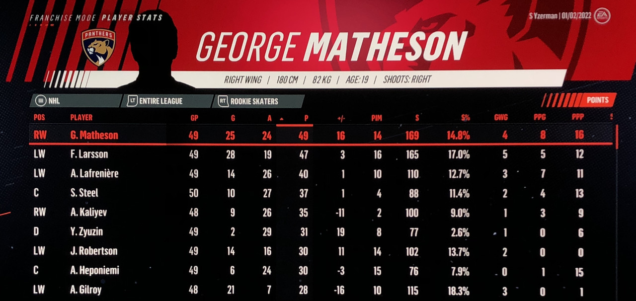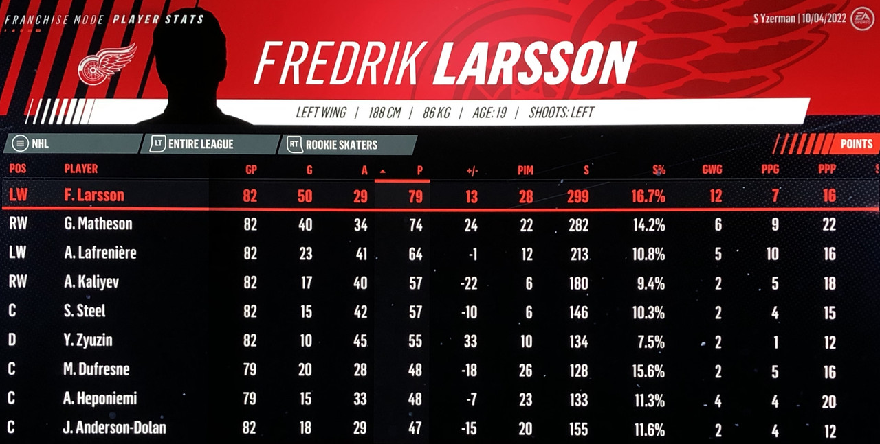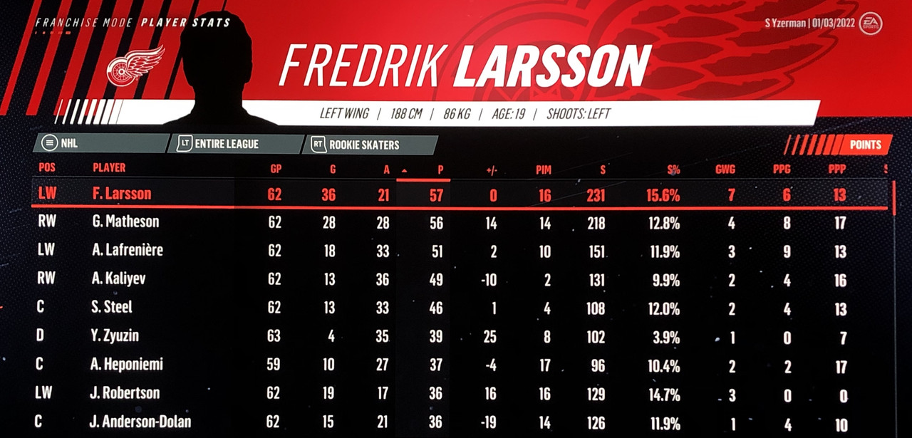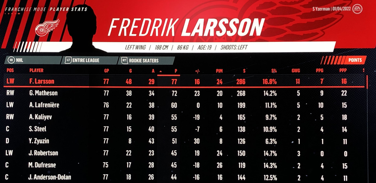 I have to admit, part way into this season, I was looking at George Matheson’s (Florida’s #2 pick in 2021) stats with envy, thinking I might have picked the wrong guy, but then Larsson really picked up a notch & proved his worth. (In recent years of simming EA NHL games I don’t think I have ever seen two rookies score so many goals combined in one season – combined they scored 90!)
