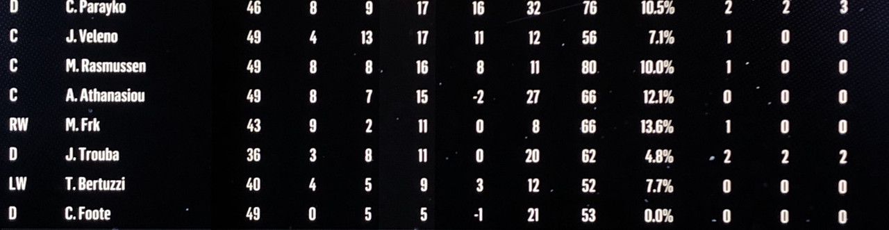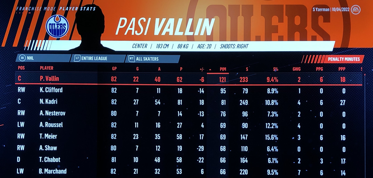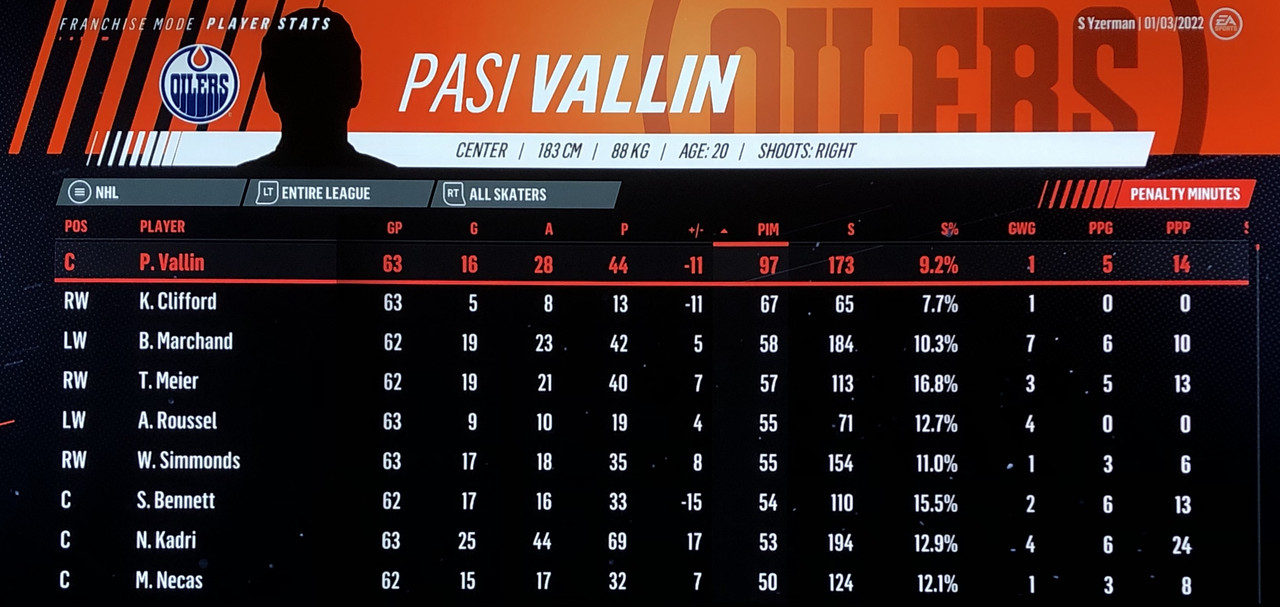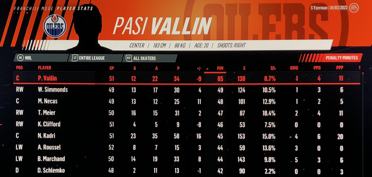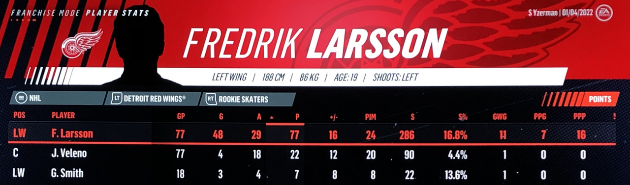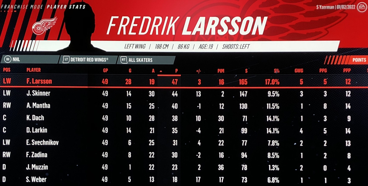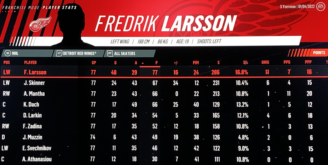 I have to admit, part way into this season, I was looking at George Matheson’s (Florida’s #2 pick in 2021) stats with envy, thinking I might have picked the wrong guy, but then Larsson really picked up a notch & proved his worth. (In recent years of simming EA NHL games I don’t think I have ever seen two rookies score so many goals combined in one season – combined they scored 90!)