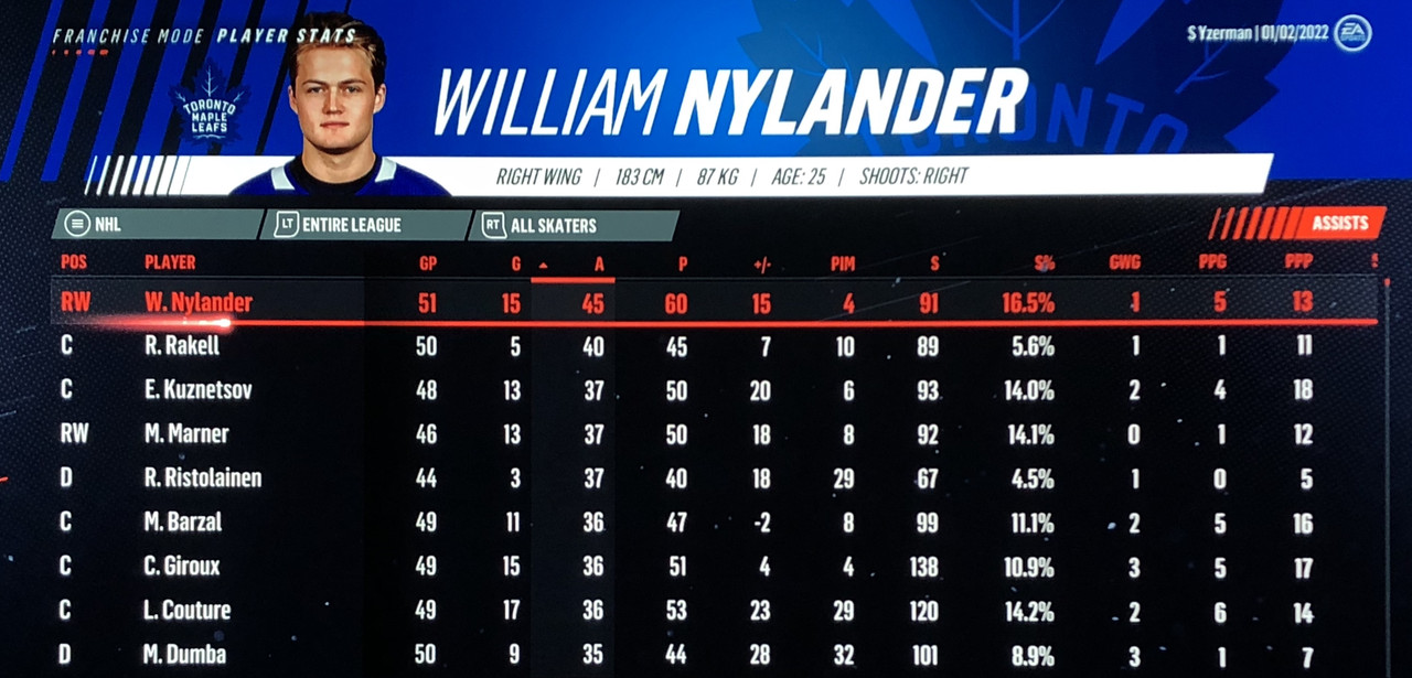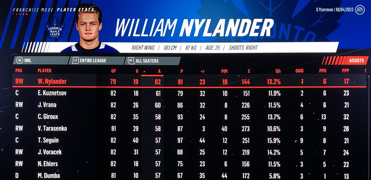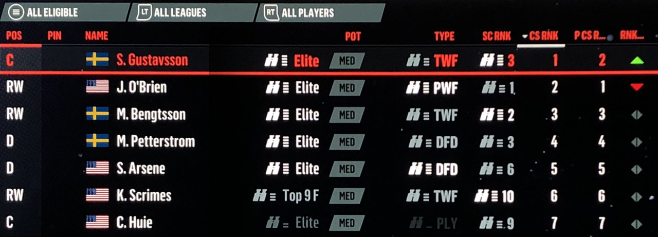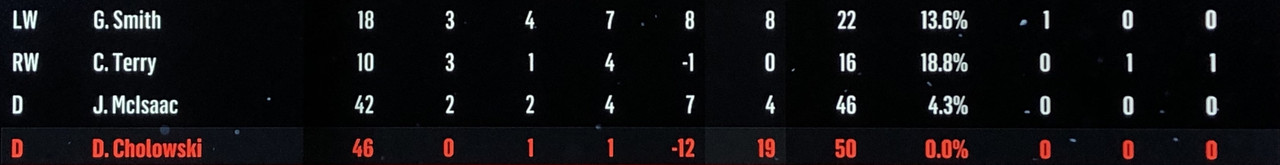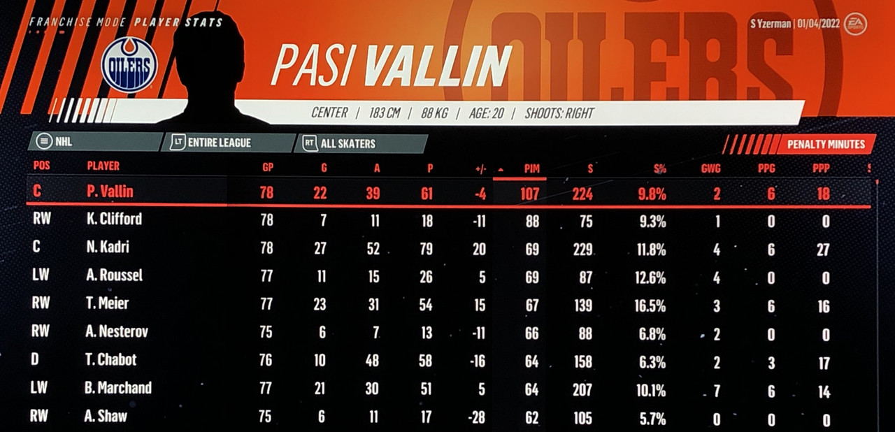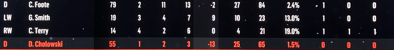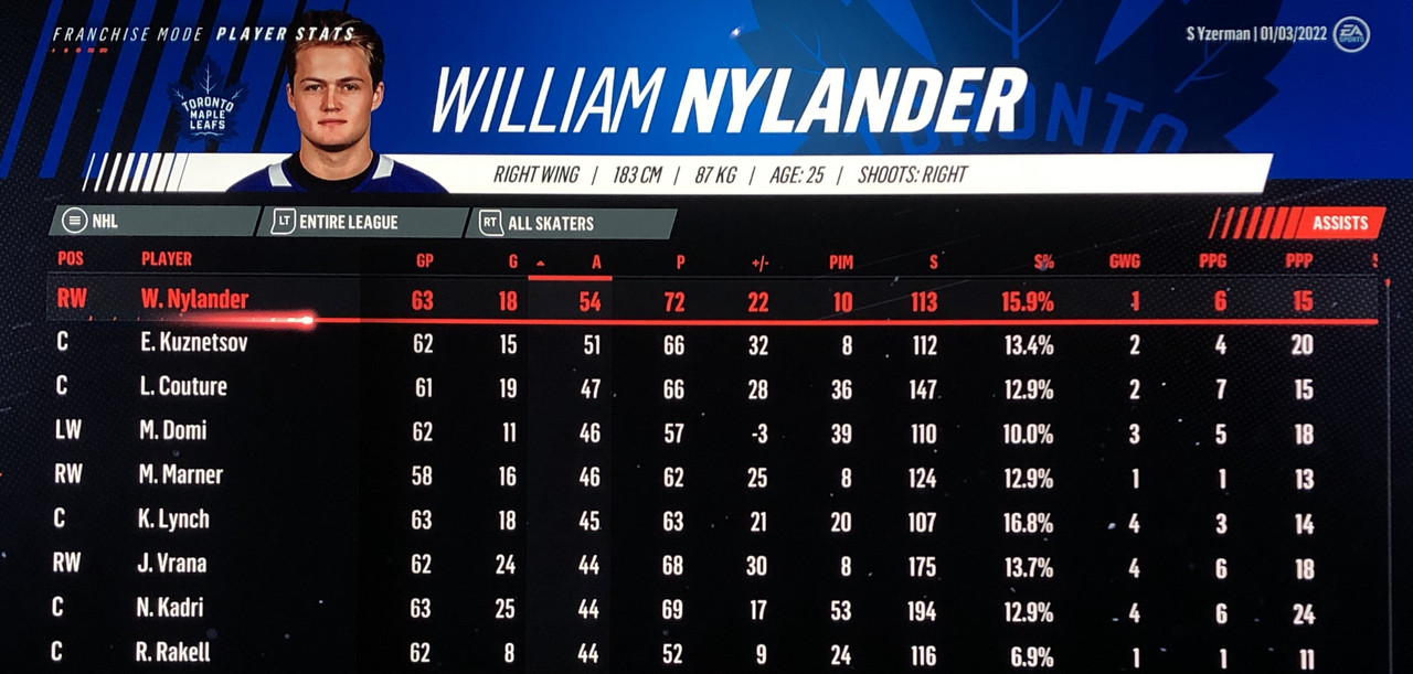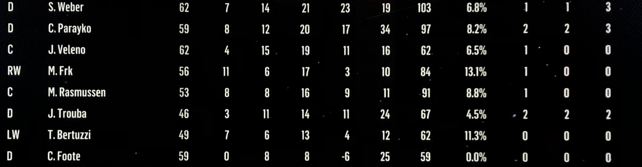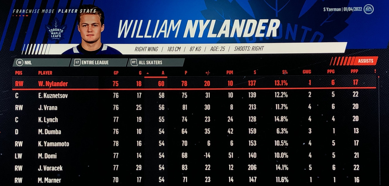 I have to admit, part way into this season, I was looking at George Matheson’s (Florida’s #2 pick in 2021) stats with envy, thinking I might have picked the wrong guy, but then Larsson really picked up a notch & proved his worth. (In recent years of simming EA NHL games I don’t think I have ever seen two rookies score so many goals combined in one season – combined they scored 90!)