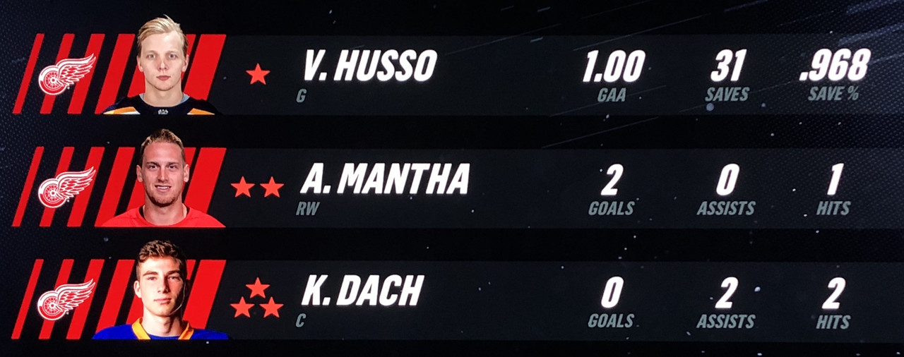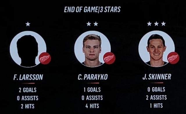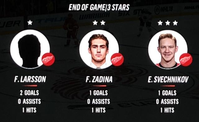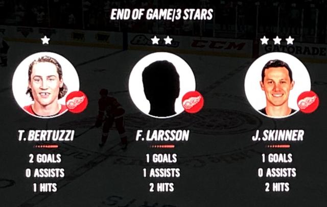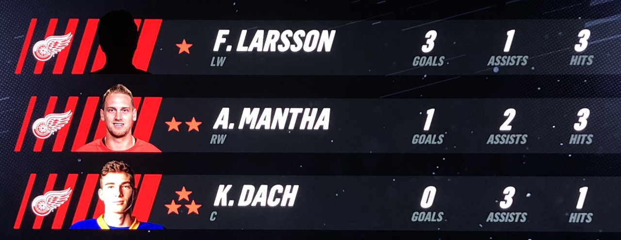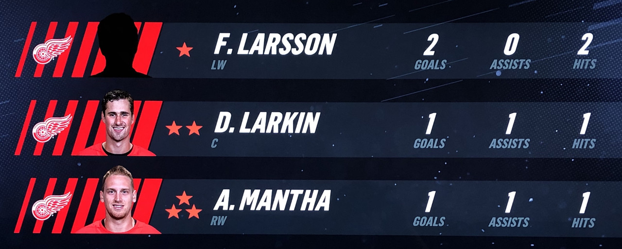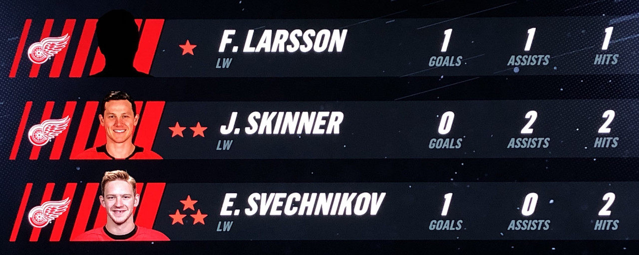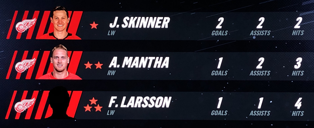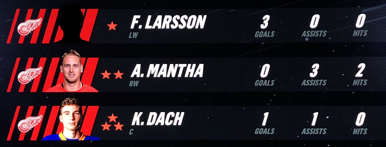 Larsson Was brilliant in his performance, with Blashill relocating him to the 1st line with Mantha & Dach, who were awarded the 2nd & 3rd Stars in a great line chemistry performance.