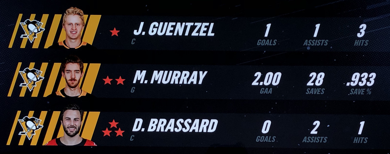 Fredrik Larsson scored twice during the 1st period & Jeff Skinner scored in the 2nd, however the door was always left ajar with the Penguins going goal for goal throughout the game. That was until going into the final period, with the scores tied at 3-3, Penguins Brian Rust scored with only 2:44 remaining to steal a big win.