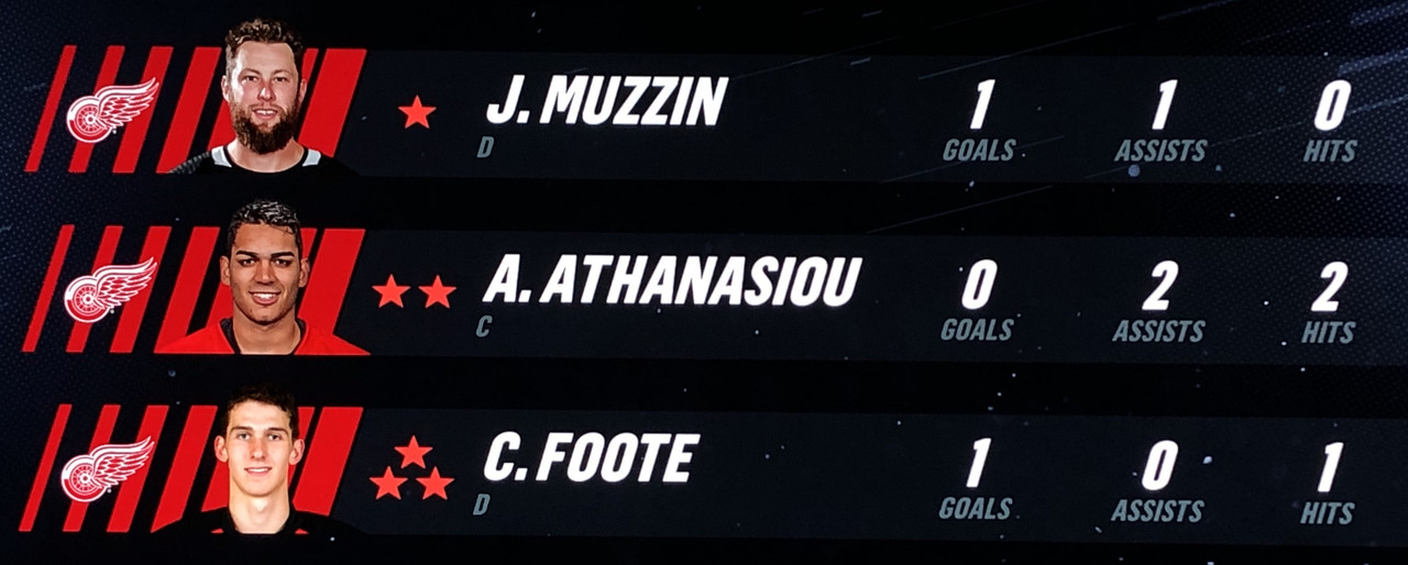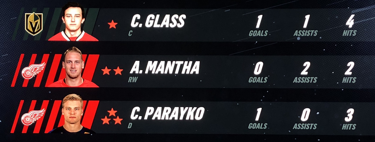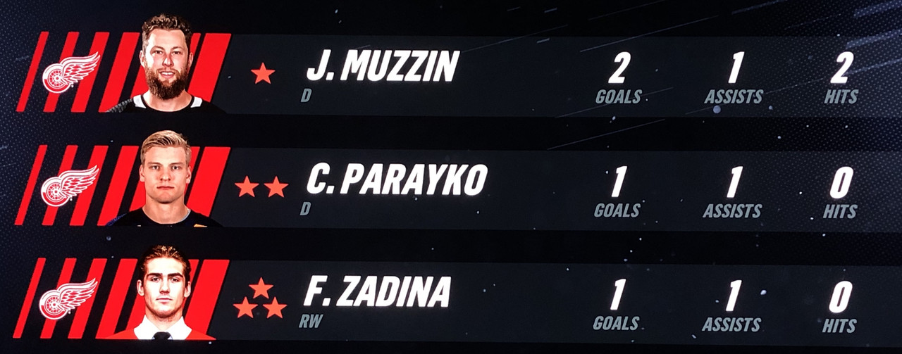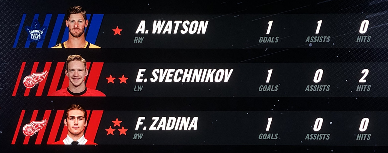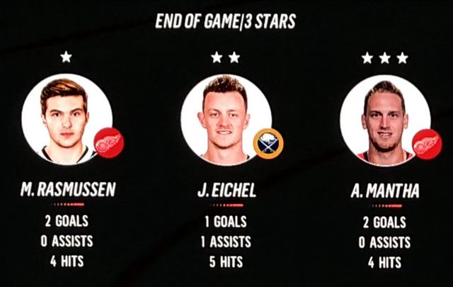 Anthony Mantha & Michael Rasmussen top scored for the Red Wings with 2 goals each, with wingmen Fredrick Larsson & Evgeny Svechnikov both tallying 3 assists each for the game.