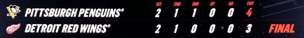Tonight the Wings held a 2-1 lead moving into the final period, however they capitulated, allowing Penguin’s Evgeny Malkin, Sidney Crosby & Brian Dumoulin to score, handing the Wings another critical loss.