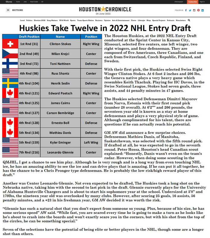 Houston would see a number of significant injuries early in the season, to include Jordan Eberle (8 games), AJ Likens (2 games), Rourke Chartier (5 games), Georg Dreiber (8 games), Thomas Hickey (8 games), and Anton Lindholm (2 games). This did give some rookies look at the ice, to include Dimitri Shirokov (1 game, 2 assists), Brian Cousins (1 game), and Cale Fleury (5 games). Th simulateous injuries to Likens, Eberle, and Chartier forced management to call up Left Winger Georg Dreiber from Arlington. At twenty years old, Dreiber has garnered a lot of interest across the league, with pundits predicting his ceiling from as high as 1st Line Elite to AHL top six.