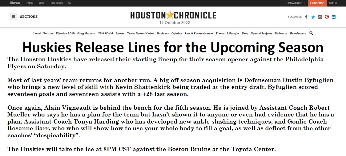 Do the Huskies make the playoffs? I am not going to make this mistake again. I said a definitive “NO!” last season and they went to the Stanley Cup Finals. However, not wanting to jinx the team, I will say “NO!” again.