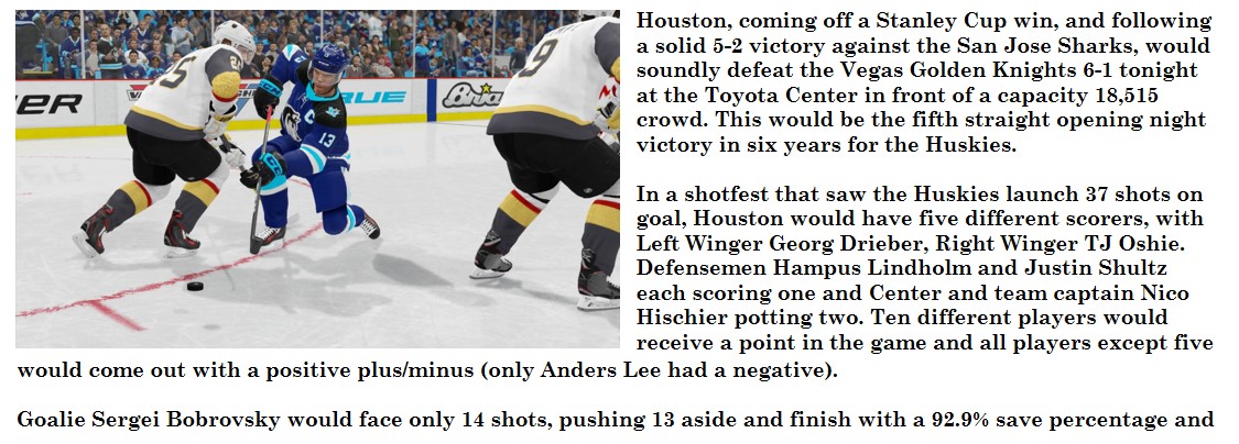 This week is a Houston Huskies. This team is truly a phenomenon in the NHL. Having only been in the league since the 2018-19 season, they have one President’s Trophy, two Division titles, Three Conference titles, and two Stanley Cups. The team has made the playoffs every year of their existence and are looking to do the same this season.