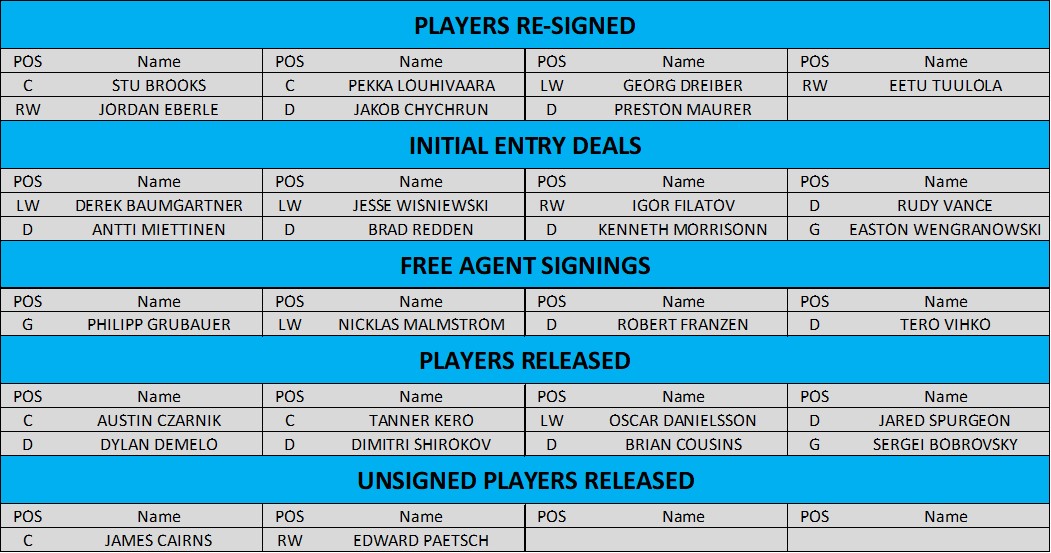 The big hit was when goalie Sergei Bobrovsky announced to the team that he wanted to test the free agent market. The thirty six year old had been with the Huskies since before the doors opened for the first time (he was signed as a free agent and not drafted), leading the team to two Stanley Cups, and winning the Conn Smythe for the playoffs MVP during one of the runs. He also won the Vezina Trophy for be goaltender twice during his tenure.
