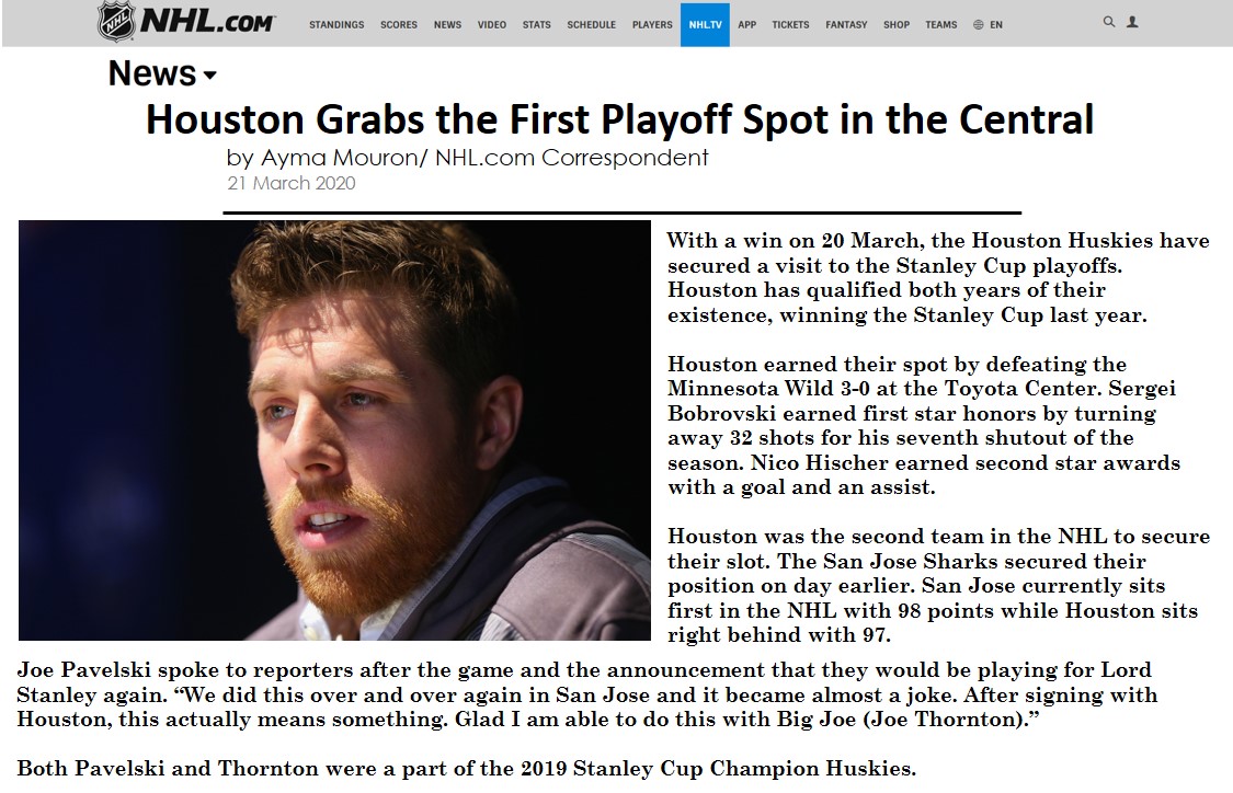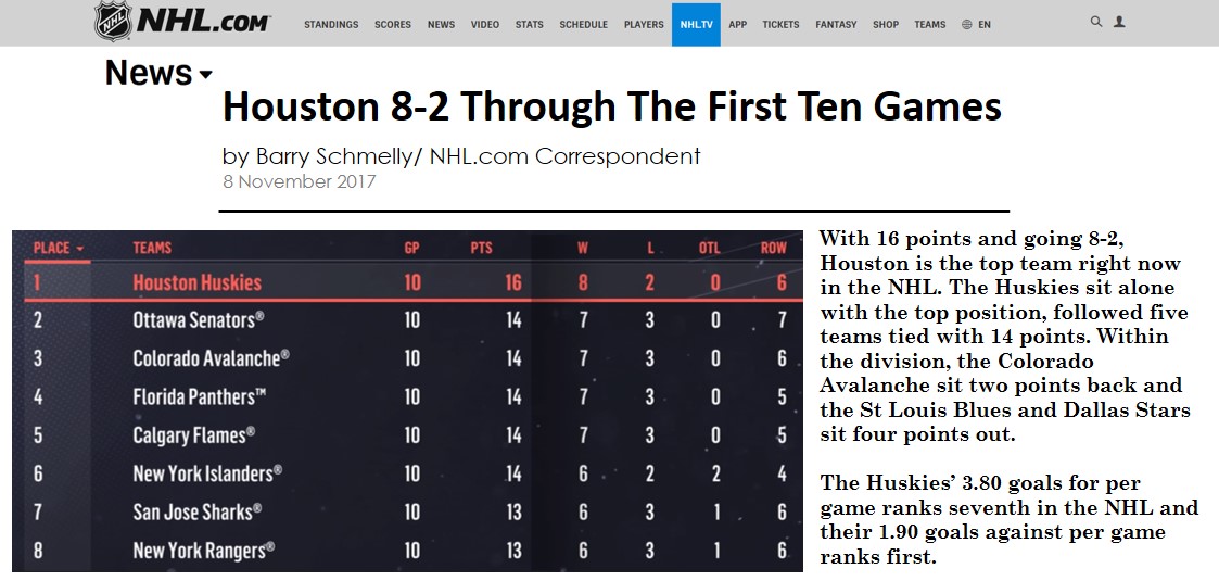 After the Houston Huskies played their 41st game on 9 January, they were sitting with a record of 26-14-1, good for 53 points and sitting third in the Central Division and fifth in the NHL. That being said, Houston has only two points on the San Jose Sharks, who sit outside the playoff window (Colorado Avalanche and the Winnipeg Jets also sit two points back in wildcard positions). That said, Houston only sits three points behind Dallas for lead of the Central Division and seven points behind the league leaders, the Florida Panthers. Everything being equal, what are the chances of a repeat by the Huskies? Let’s break it down: