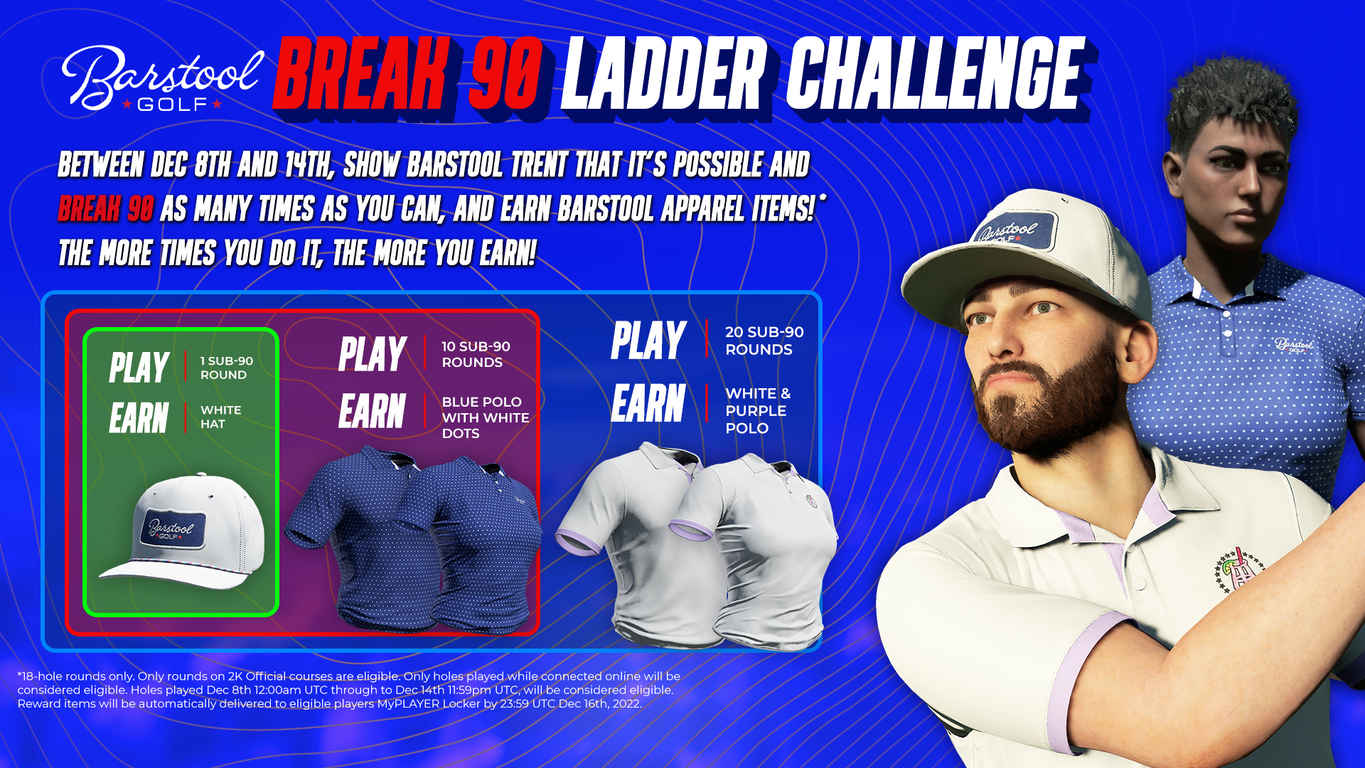 For those interested, playing rounds in 2K23 from Dec. 8-14 and breaking 90 will allow you to rack up Barstool Sports apparel. Breaking 90 once gets you a hat, breaking 90 ten times gets you a blue polo, and breaking 90 twenty times gets you a white polo.