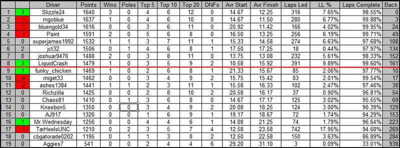 <TABLE style="WIDTH: 254pt; BORDER-COLLAPSE: collapse" cellSpacing=0 cellPadding=0 width=339 border=0 x:str><COLGROUP><COL style="WIDTH: 206pt; mso-width-source: userset; mso-width-alt: 10057" width=275><COL style="WIDTH: 48pt" width=64><TBODY><TR style="HEIGHT: 12.75pt" height=17><TD style="BORDER-RIGHT: #d4d0c8; BORDER-TOP: #d4d0c8; BORDER-LEFT: #d4d0c8; WIDTH: 206pt; BORDER-BOTTOM: #d4d0c8; HEIGHT: 12.75pt; BACKGROUND-COLOR: transparent" width=275 height=17>x8. LiquidCrash ---------- #9 Kasey Kahne</TD><TD style="BORDER-RIGHT: #d4d0c8; BORDER-TOP: #d4d0c8; BORDER-LEFT: #d4d0c8; WIDTH: 48pt; BORDER-BOTTOM: #d4d0c8; BACKGROUND-COLOR: transparent" align=right width=64 x:num>1</TD></TR><TR style="HEIGHT: 12.75pt" height=17><TD style="BORDER-RIGHT: #d4d0c8; BORDER-TOP: #d4d0c8; BORDER-LEFT: #d4d0c8; BORDER-BOTTOM: #d4d0c8; HEIGHT: 12.75pt; BACKGROUND-COLOR: transparent" height=17>x18. Slizzle24 ------------ #16 Greg Biffle</TD><TD style="BORDER-RIGHT: #d4d0c8; BORDER-TOP: #d4d0c8; BORDER-LEFT: #d4d0c8; BORDER-BOTTOM: #d4d0c8; BACKGROUND-COLOR: transparent" align=right x:num>2</TD></TR><TR style="HEIGHT: 12.75pt" height=17><TD style="BORDER-RIGHT: #d4d0c8; BORDER-TOP: #d4d0c8; BORDER-LEFT: #d4d0c8; BORDER-BOTTOM: #d4d0c8; HEIGHT: 12.75pt; BACKGROUND-COLOR: transparent" height=17>x5. jct32 ---------------- #18 Kyle Busch</TD><TD style="BORDER-RIGHT: #d4d0c8; BORDER-TOP: #d4d0c8; BORDER-LEFT: #d4d0c8; BORDER-BOTTOM: #d4d0c8; BACKGROUND-COLOR: transparent" align=right x:num>3</TD></TR><TR style="HEIGHT: 12.75pt" height=17><TD style="BORDER-RIGHT: #d4d0c8; BORDER-TOP: #d4d0c8; BORDER-LEFT: #d4d0c8; BORDER-BOTTOM: #d4d0c8; HEIGHT: 12.75pt; BACKGROUND-COLOR: transparent" height=17>x3. funky_chicken -------- #24 Jeff Gordon</TD><TD style="BORDER-RIGHT: #d4d0c8; BORDER-TOP: #d4d0c8; BORDER-LEFT: #d4d0c8; BORDER-BOTTOM: #d4d0c8; BACKGROUND-COLOR: transparent" align=right x:num>4</TD></TR><TR style="HEIGHT: 12.75pt" height=17><TD style="BORDER-RIGHT: #d4d0c8; BORDER-TOP: #d4d0c8; BORDER-LEFT: #d4d0c8; BORDER-BOTTOM: #d4d0c8; HEIGHT: 12.75pt; BACKGROUND-COLOR: transparent" height=17>x4. Mr.Wednesday --------- #88 Dale Jr.</TD><TD style="BORDER-RIGHT: #d4d0c8; BORDER-TOP: #d4d0c8; BORDER-LEFT: #d4d0c8; BORDER-BOTTOM: #d4d0c8; BACKGROUND-COLOR: transparent" align=right x:num>5</TD></TR><TR style="HEIGHT: 12.75pt" height=17><TD style="BORDER-RIGHT: #d4d0c8; BORDER-TOP: #d4d0c8; BORDER-LEFT: #d4d0c8; BORDER-BOTTOM: #d4d0c8; HEIGHT: 12.75pt; BACKGROUND-COLOR: transparent" height=17>x12. Chaos81 -------------- #31 Jeff Burton</TD><TD style="BORDER-RIGHT: #d4d0c8; BORDER-TOP: #d4d0c8; BORDER-LEFT: #d4d0c8; BORDER-BOTTOM: #d4d0c8; BACKGROUND-COLOR: transparent" align=right x:num>6</TD></TR><TR style="HEIGHT: 12.75pt" height=17><TD style="BORDER-RIGHT: #d4d0c8; BORDER-TOP: #d4d0c8; BORDER-LEFT: #d4d0c8; BORDER-BOTTOM: #d4d0c8; HEIGHT: 12.75pt; BACKGROUND-COLOR: transparent" height=17>x9. joshuar9476 ---------- #17 Matt Kenseth</TD><TD style="BORDER-RIGHT: #d4d0c8; BORDER-TOP: #d4d0c8; BORDER-LEFT: #d4d0c8; BORDER-BOTTOM: #d4d0c8; BACKGROUND-COLOR: transparent" align=right x:num>7</TD></TR><TR style="HEIGHT: 12.75pt" height=17><TD style="BORDER-RIGHT: #d4d0c8; BORDER-TOP: #d4d0c8; BORDER-LEFT: #d4d0c8; BORDER-BOTTOM: #d4d0c8; HEIGHT: 12.75pt; BACKGROUND-COLOR: transparent" height=17>x2. Richzilla ------------ #99 Carl Edwards</TD><TD style="BORDER-RIGHT: #d4d0c8; BORDER-TOP: #d4d0c8; BORDER-LEFT: #d4d0c8; BORDER-BOTTOM: #d4d0c8; BACKGROUND-COLOR: transparent" align=right x:num>9</TD></TR><TR style="HEIGHT: 12.75pt" height=17><TD style="BORDER-RIGHT: #d4d0c8; BORDER-TOP: #d4d0c8; BORDER-LEFT: #d4d0c8; BORDER-BOTTOM: #d4d0c8; HEIGHT: 12.75pt; BACKGROUND-COLOR: transparent" height=17>x14. superjames1992 ------- #6 David Ragan</TD><TD style="BORDER-RIGHT: #d4d0c8; BORDER-TOP: #d4d0c8; BORDER-LEFT: #d4d0c8; BORDER-BOTTOM: #d4d0c8; BACKGROUND-COLOR: transparent" align=right x:num>12</TD></TR><TR style="HEIGHT: 12.75pt" height=17><TD style="BORDER-RIGHT: #d4d0c8; BORDER-TOP: #d4d0c8; BORDER-LEFT: #d4d0c8; BORDER-BOTTOM: #d4d0c8; HEIGHT: 12.75pt; BACKGROUND-COLOR: transparent" height=17>x16. AJ917 ---------------- #29 Kevin Harvick</TD><TD style="BORDER-RIGHT: #d4d0c8; BORDER-TOP: #d4d0c8; BORDER-LEFT: #d4d0c8; BORDER-BOTTOM: #d4d0c8; BACKGROUND-COLOR: transparent" align=right x:num>14</TD></TR><TR style="HEIGHT: 12.75pt" height=17><TD style="BORDER-RIGHT: #d4d0c8; BORDER-TOP: #d4d0c8; BORDER-LEFT: #d4d0c8; BORDER-BOTTOM: #d4d0c8; HEIGHT: 12.75pt; BACKGROUND-COLOR: transparent" height=17>x17. Kneebon5 ------------- #8 Mark Martin</TD><TD style="BORDER-RIGHT: #d4d0c8; BORDER-TOP: #d4d0c8; BORDER-LEFT: #d4d0c8; BORDER-BOTTOM: #d4d0c8; BACKGROUND-COLOR: transparent" align=right x:num>15</TD></TR><TR style="HEIGHT: 12.75pt" height=17><TD style="BORDER-RIGHT: #d4d0c8; BORDER-TOP: #d4d0c8; BORDER-LEFT: #d4d0c8; BORDER-BOTTOM: #d4d0c8; HEIGHT: 12.75pt; BACKGROUND-COLOR: transparent" height=17>x11. cbgatorade0202 ------- #2 Kurt Busch</TD><TD style="BORDER-RIGHT: #d4d0c8; BORDER-TOP: #d4d0c8; BORDER-LEFT: #d4d0c8; BORDER-BOTTOM: #d4d0c8; BACKGROUND-COLOR: transparent" align=right x:num>16</TD></TR><TR style="HEIGHT: 12.75pt" height=17><TD style="BORDER-RIGHT: #d4d0c8; BORDER-TOP: #d4d0c8; BORDER-LEFT: #d4d0c8; BORDER-BOTTOM: #d4d0c8; HEIGHT: 12.75pt; BACKGROUND-COLOR: transparent" height=17>x7. ashes1384 ------------ #20 Tony Stewart</TD><TD style="BORDER-RIGHT: #d4d0c8; BORDER-TOP: #d4d0c8; BORDER-LEFT: #d4d0c8; BORDER-BOTTOM: #d4d0c8; BACKGROUND-COLOR: transparent" align=right x:num>18</TD></TR><TR style="HEIGHT: 12.75pt" height=17><TD style="BORDER-RIGHT: #d4d0c8; BORDER-TOP: #d4d0c8; BORDER-LEFT: #d4d0c8; BORDER-BOTTOM: #d4d0c8; HEIGHT: 12.75pt; BACKGROUND-COLOR: transparent" height=17>x13. bluengold34 ---------- #12 Ryan Newman</TD><TD style="BORDER-RIGHT: #d4d0c8; BORDER-TOP: #d4d0c8; BORDER-LEFT: #d4d0c8; BORDER-BOTTOM: #d4d0c8; BACKGROUND-COLOR: transparent" align=right x:num>21</TD></TR><TR style="HEIGHT: 12.75pt" hei
