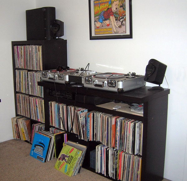 I'm thinking of ordering a matching table top or floating tv console so I can move my turntable and speakers and set it on the top (which is the side in the picture) of the bookshelf. In my search for the best vinyl shelves, I came across this really helpful website which basically takes Ikea furniture and customizes them into some pretty nice looking dj consoles.