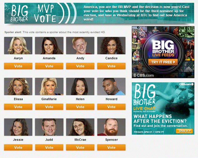 Also...Rachel(and other former BB HGs) are campaigning for a certain HG to be nominated with the MVP vote. This MVP vote is completely unfair. The fans of these former BB players are obviously BB fans, so basically they control the vote. Production doesn't need to rig stuff because the former HGs that production loved, does it for them.