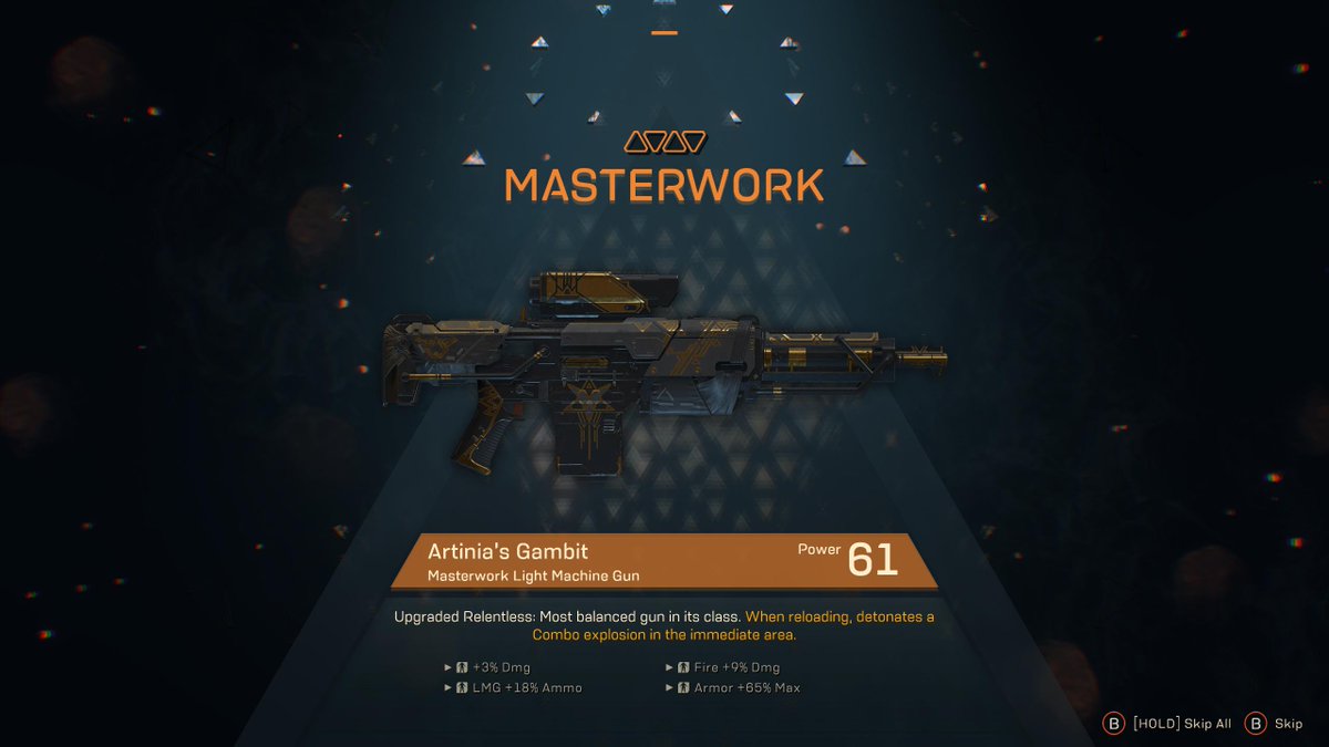 I think I have 5 Artinias Gambit now. 3 at 61 and two lower plus the blue print. I’ve got a shotgun and grenade launcher MW. I’ve got a bunch of components and both special weapons although I don’t have my preferred primer and detonator combo. Got my first and only Legendary Hail Titan but it’s bugged and won’t trigger a combo so I’m not using it.