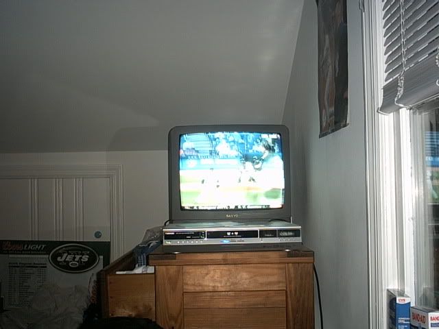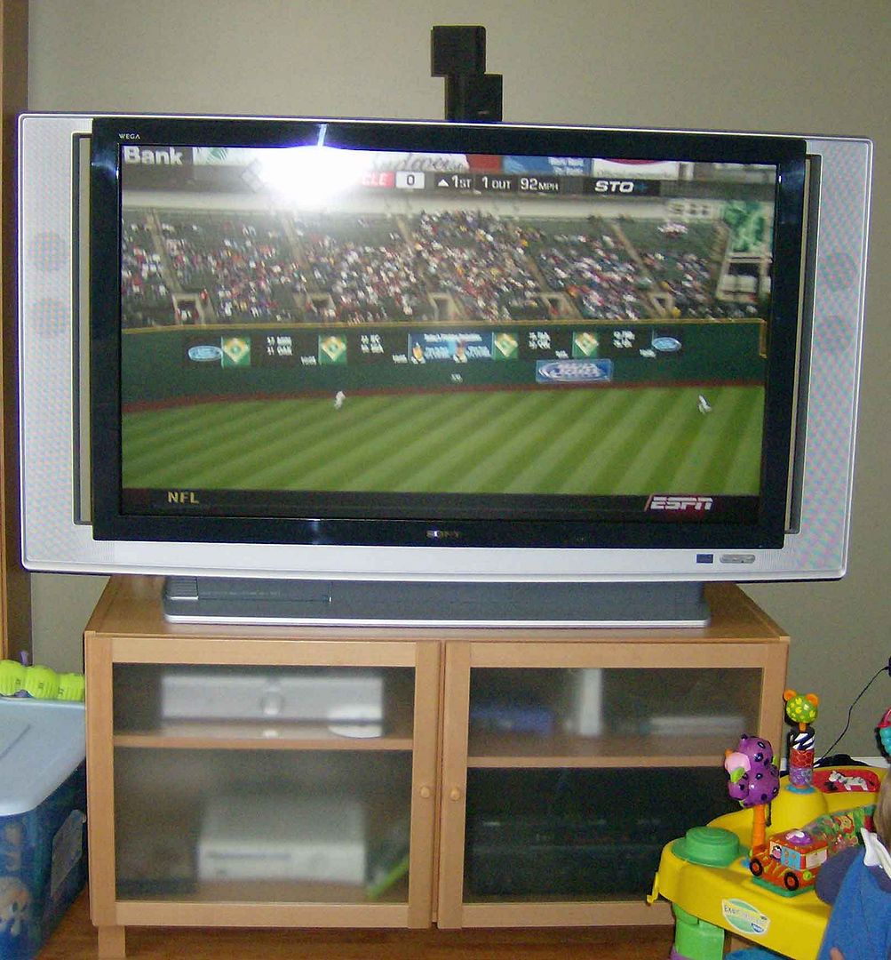 Never mind the kids toys, or the back of my son's head lol. The receiver is kinda tough to see, it's in the bottom right corner. On top of that is a few routers and a cable modem. Bottom left is the 360, Top left is the DTVHD reciever. On top is the center channel speaker for my Bose system.