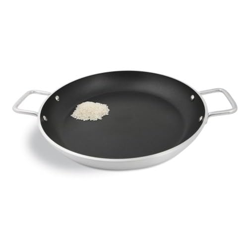 Yeah I'm just gonna do it indoors. I have a massive paella pan, but it's a non-stick one and I don't want to put it out on the grill really. You can get some nice soccarat just by kicking up the heat for the last 5 minutes until you smell the rice toasting a bit... not the most authentic preparation, but it'll work in a pinch. I do want to get a regular-sized normal paella pan though -- this one's essentially a giant shallow skillet with small handles on each side. We'll just be using two burners and rotating it continuously to keep the heat even. This is what my pan looks like: